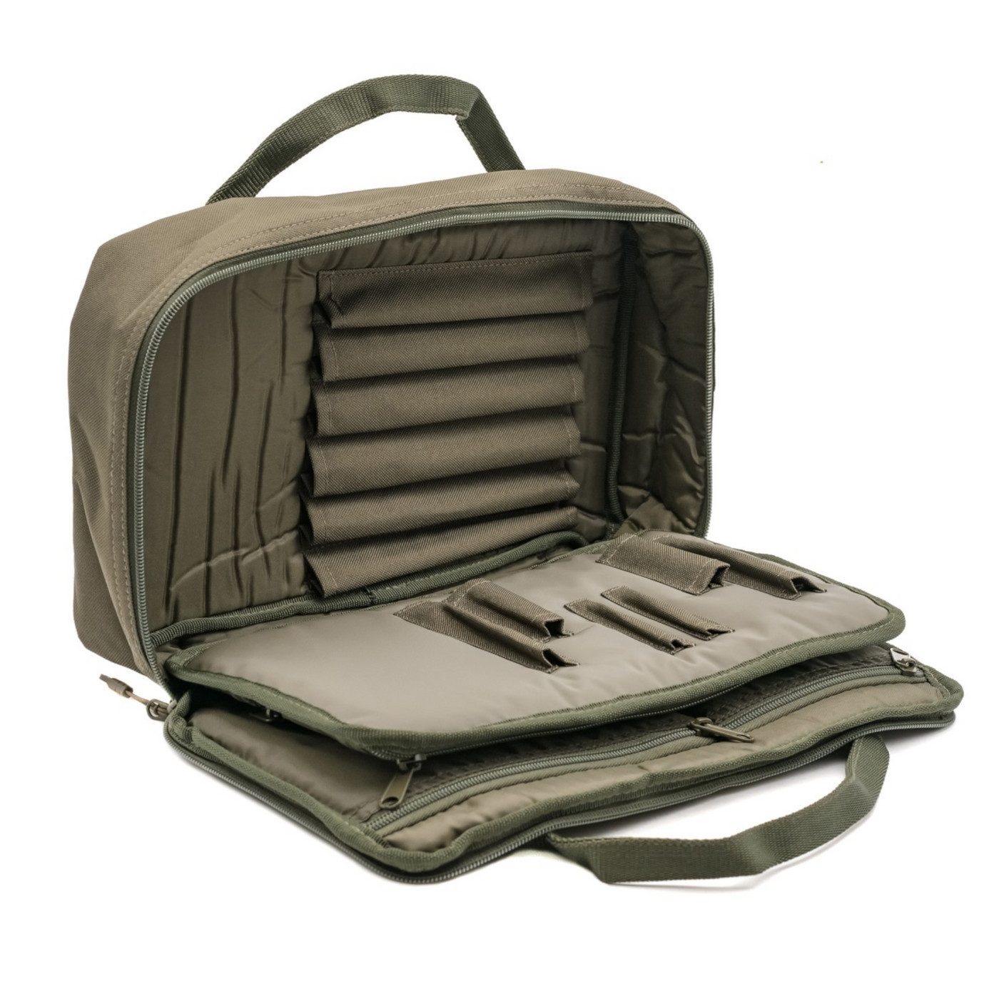 Korda Singlez Bag - Korda Singlez Bag - Diese Tasche von Korda wurde für diejenigen entwickelt, die ihr Singlez-System – sei es die Edelstahlversion oder die leichte schwarze Version – in gutem Zustand halten und sicherstellen möchten, dass zwischen den Sitzungen keine Teile verloren gehen. Diese robuste Tasche verfügt über einen Tragegriff und einen Doppelreißverschluss für einfachen Zugriff. Der Innenraum ist mit gesteppter Polsterung und speziell entworfenen Hüllen und Fächern für alle Komponenten des Singlez ausgestattet, einschließlich einer gepolsterten Trennwand in der Mitte. Die Hüllen wurden so entworfen, dass sie für jede Länge von aufrechten Gegenständen geeignet sind, einschließlich Ihres Bissanzeigers oder Ihrer hinteren Rutenauflage. Außerdem gibt es separate Hüllen für Spikes. Die Oberseite der Tasche hat Reißverschlussfächer für die Buzzer Bars und Gegenstände wie Stage Stands und Stabilisatoren. Sie wurde für die Verwendung mit den Zwei- und Drei-Ruten-Versionen des Singlez entworfen.