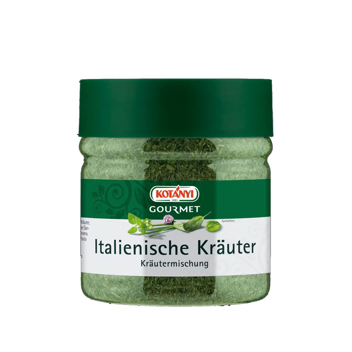 Kotányi GmbHZutaten: Oregano, Basilikum, Majoran, Rosmarin, Bohnenkraut, Thymian, Salbei. Kann Spuren von glutenhältigem GETREIDE, EI, SOJA, MILCH (LACTOSE), SCHALENFRÜCHTE, SELLERIE, SENF, SESAM und SCHWEFELDIOXID und SULFITE enthalten.