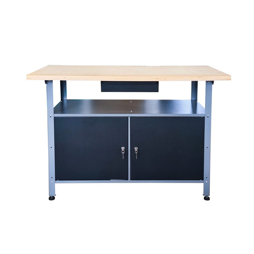 Maße Werkbank: 120 x 60 x 85 cm | Ausstattung: 3 cm Arbeitsplatte, Schublade, Einlegeboden, abschließbare Tür, verstellbare Füße | Material: Sperrholz, Metall