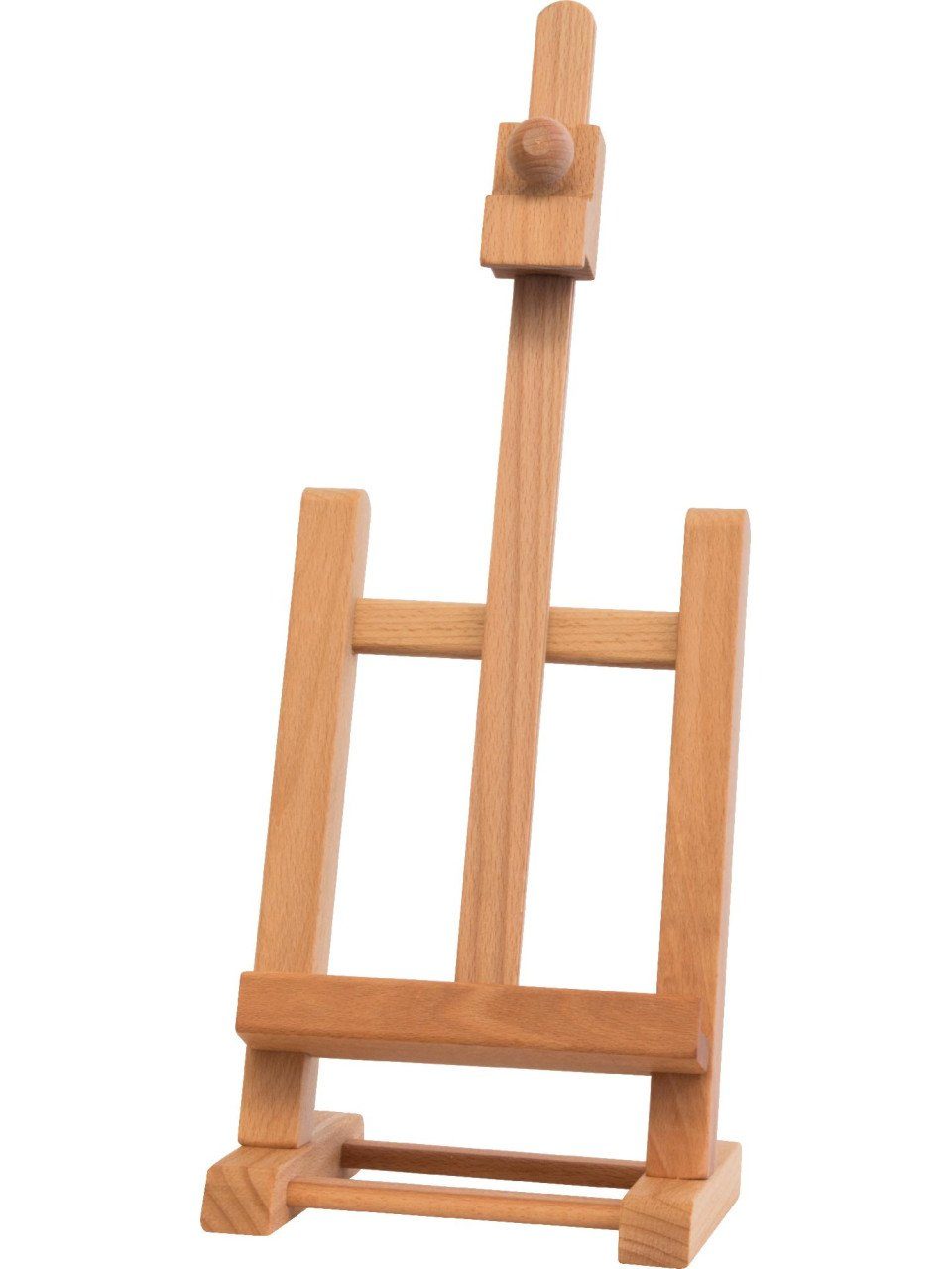 Produktdetails: Gesamthöhe: 42,5 cm | maximale Bildhöhe: 30 cm | Fußmaß: 16 x 14 cm | Tischstaffelei mit H-Fuß | perfekt für kleinformatige Keilrahmen | aus masivem Buchenholz, mit Leinöl getränkt | FSC-zertifiziert | Gewicht: 347 g |