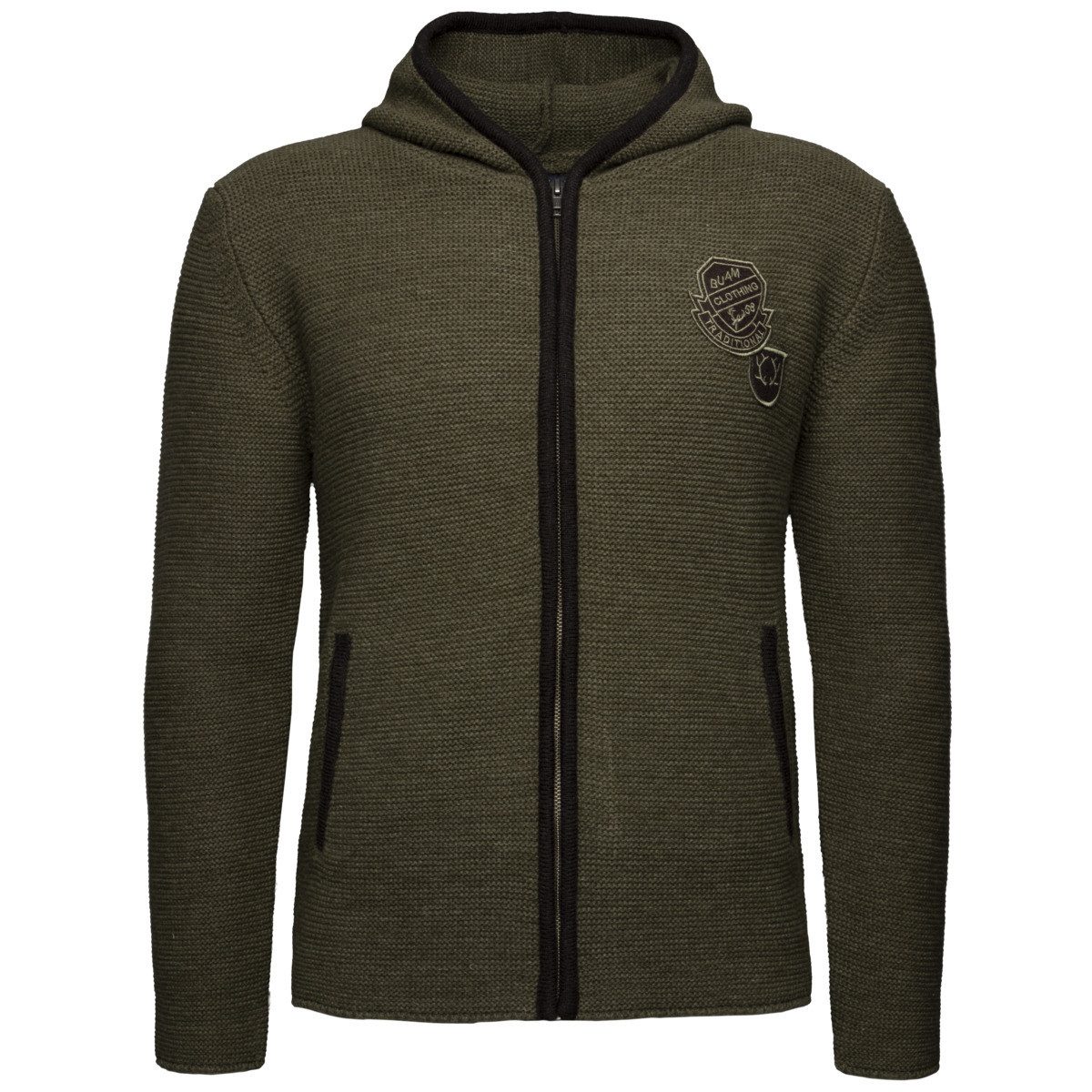 Seit mehr als 60 Jahren ist Krüger Dirndl GmbH als Trachtenhersteller nicht mehr vom Markt wegzudenken. Sie haben sich als Ziel gesetzt qualitativ hochwertige und individuelle Trachtenmode zu fairen Preisen zu verkaufen. Die Strickjacke Bastian überzeugt durch ihr lässiges Design und ist ein echtes Must-Have für die Saison. Die fesche Trachtenjacke mit diversen Patches lässt sich hervorragend zur Lederhose und einem Hemd kombinieren, kann aber auch perfekt in einen Freizeit-Look integriert werden. Der Strickhoodie besteht aus hochwertigem Material wie Wolle und Polyamid und bietet damit angenehmen Tragekomfort. Ein praktischer Reißverschluss sorgt für einen einfachen Verschluss, während der Rundhalsausschnitt mit großzügiger Kapuze für ein bequemes Tragegefühl sorgt. Der Hoodie ist mit zwei Seitentaschen ausgestattet und besitzt Patches auf der Brust sowie am linken Ärmel, die ihm einen besonderen Charme verleihen. Dieses vielseitige Kleidungsstück vervollständigt jedes Oktoberfest-Outfit und ist ideal für modische Trachten-Liebhaber.