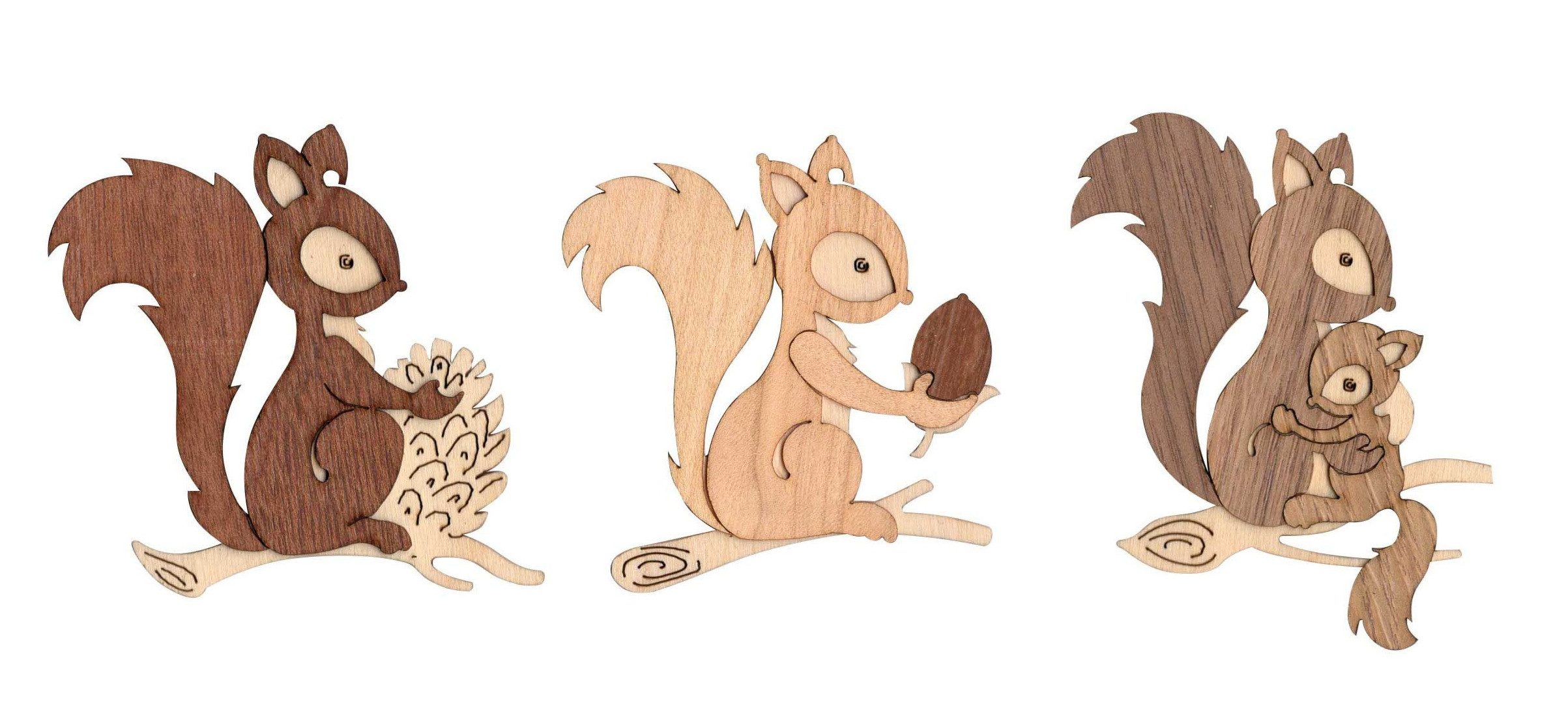 Die Kombination aus Sperrholz und Echtholzfurnier sorgt für eine besonders authentische Optik, während die aufgesetzten Applikationen die Figuren plastisch erscheinen lassen. Jedes Detail wurde sorgfältig ausgearbeitet, sodass die Eichhörnchen lebendig und freundlich wirken.