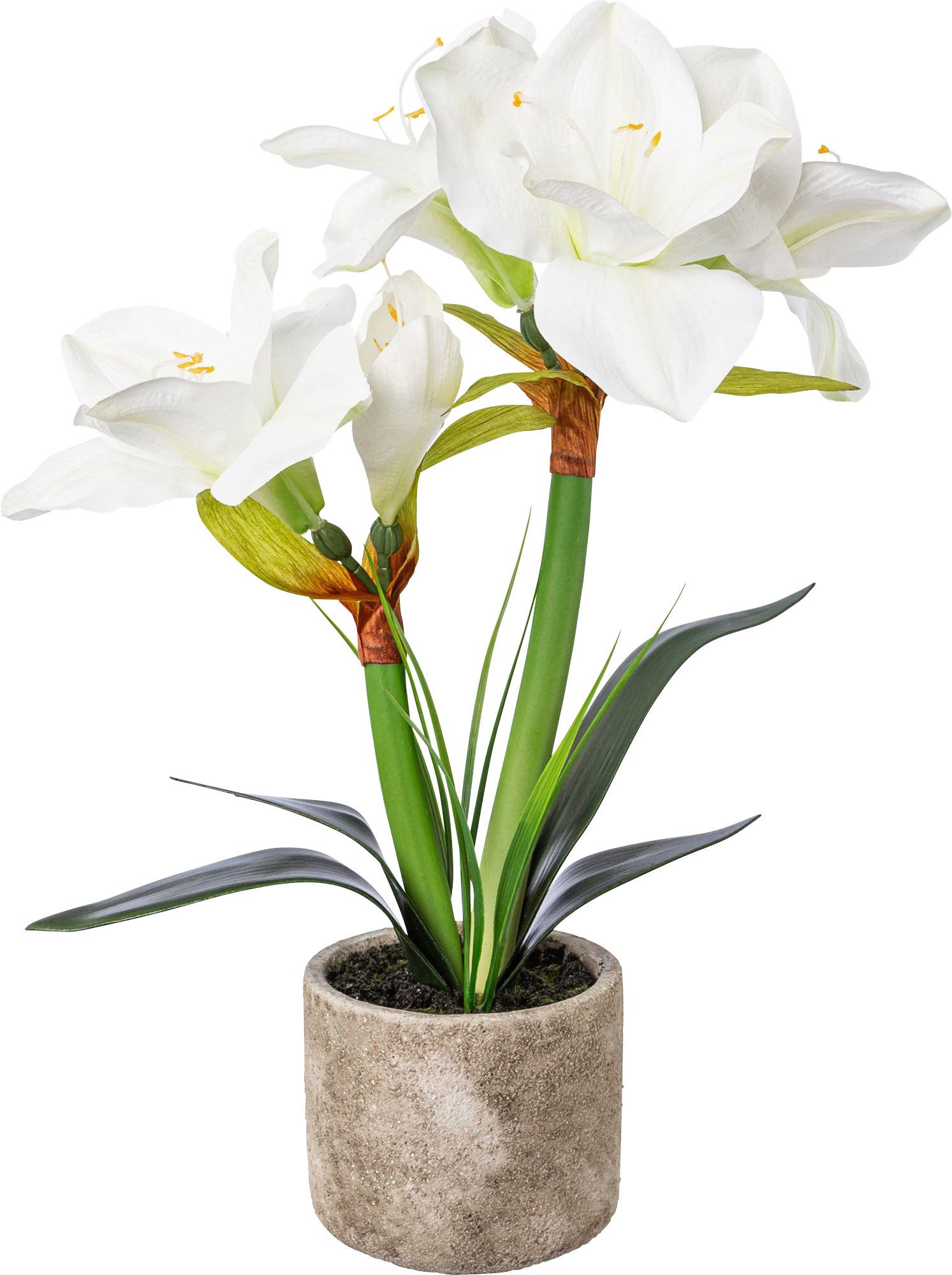Kunstpflanze Amaryllis. Dieses dekorative Wohnaccessoire ist ein prächtiger Hingucker, der nie verblüht. Liebevoll und detailgetreu der Natur nachempfunden, bereichert die hübsche Kunstpflanze im Zementtopf Ihr Zuhause. Ganz ohne Mühe und aufwendige Pflege sieht die Amaryllis immer perfekt aus. Aus Kunststoff.