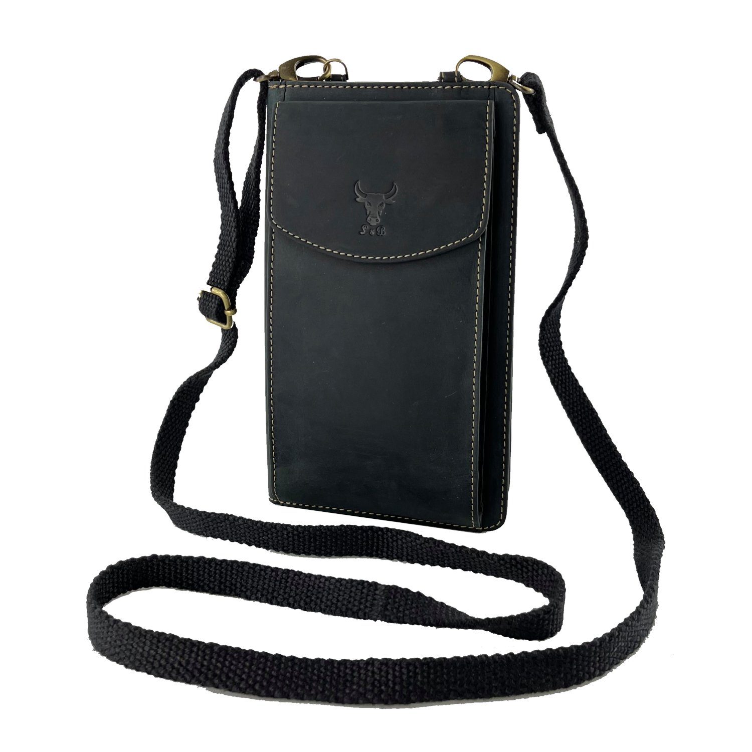 Diese L&B Geldbörse mit aufgesetztem Fach für dein Smartphone bzw. Handy aus feinstem Büffelleder vereint alles in Einem. Sie ist Brieftasche, Geldbörse, Abendtasche und Handyhülle. Die 19cm x 11cm x 4,5cm große Tasche/Geldbörse bietet ausreichend Platz für Handy, Karten, Geld und andere Kleinigkeiten. Die superleichte Crossbody Bag trägt sich besonders bequem, durch den verstellbaren (bis zu 130cm), abnehmbaren und weichen Canvasriemen. Der Innenaufbau mit 12 Karteneinsteckfächern, 4 Geldscheinfächern und dem großen Münzgeldfach mit Reißverschluss ist durch einen robusten, hochwertigen Metallreißverschluss gesichert. Die RFID-Schutz-Funktion verhindert das Auslesen von Kreditkarten und anderen sensiblen Daten. Das zu 100% echte, per Hand verarbeitete Büffelleder, sieht nicht nur gut aus, es bekommt zudem auch im Laufe der Zeit den bekannten Used-Look. Maße komplett: 19cm x 11cm x 4,5cm. Maße Handyfach außen: 17cm x 9cm x 1,5cm also passend für alle gängigen Handygrößen bis 6,5 Zoll...Achtung: um bei diesem hochwertigen Produkt die bestmögliche Optik zu erzielen, haben wir bei den Lederfarben brown, graphit und tan alle Metallteile (Reißverschluss, Oesen, Karabiner in Messingoptik und bei den Farben red und blue in Metallicschwarz gewählt.