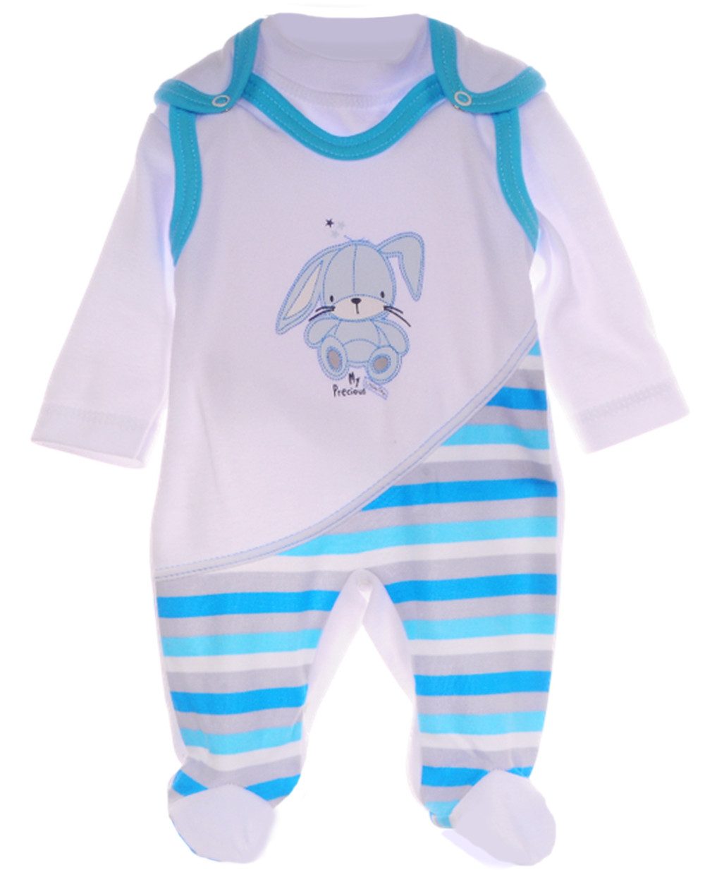 Dieses liebevoll zusammengestellte 2-teilige Babyset besteht aus einem ärmellosen Strampler in zarten Weiß-Türkis-Streifen mit niedlichem Hasen-Aufdruck sowie einem passenden Langarmshirt in Weiß. Ein weiches, praktisches und hübsches Outfit – ideal für Neugeborene und Babys, neutral und somit perfekt für Jungen und Mädchen. Der Strampler ist mit Druckknöpfen an den Schultern und im Schritt ausgestattet – für bequemes An- und Ausziehen sowie einfaches Wickeln. Das Langarmshirt aus 100 % reiner Baumwolle ergänzt das Set ideal und sorgt für zusätzlichen Komfort – auch in kühleren Momenten. Beide Teile sind weich, atmungsaktiv und hautfreundlich – ideal für empfindliche Babyhaut. Das Set eignet sich perfekt als Geschenk zur Geburt, für die Erstausstattung oder den Alltag – und ist für alle Jahreszeiten gut geeignet.