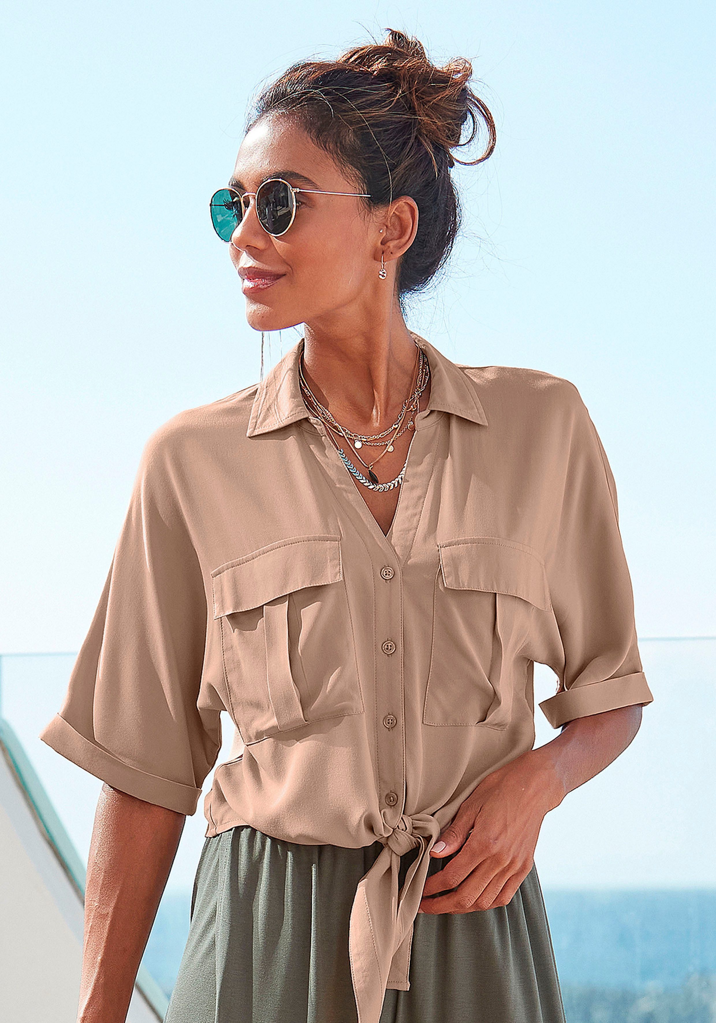 | Besondere Merkmale | mit Knotendetail und Knopfleiste, Hemdkragen, Damenbluse |