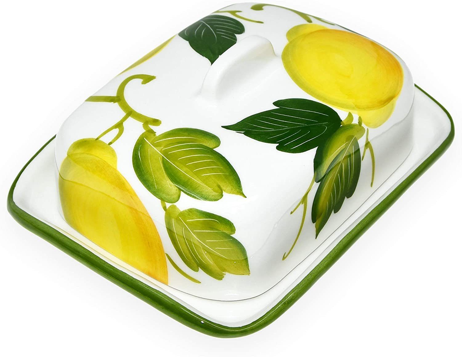 Ein handelsübliches 250 Gramm Butterstück passt bestens unter dem Deckel der zauberhaften Butterschale ca. 18x14 cm aus Keramik. Vorbei ist die Zeit, die Butter in einfarbige Butterglocken zu legen. Gönnen Sie sich ein Stück Italien bei jedem Frühstück und Abendbrot. Mit dieser Butterdose aus Keramik zieht ein Stück Italien bei Ihnen Zuhause ein! Bringen Sie Urlaubsstimmung und mediterranes Flair auf den Tisch und entdecken Sie unsere weiteren mediterranen Geschirrsets. Bei Lashuma finden Sie neben Dippschalen und Pasta Schüsseln auch Servierteller und Salatschalen sowie Ölflaschen und Vorrats Keramikdosen.
