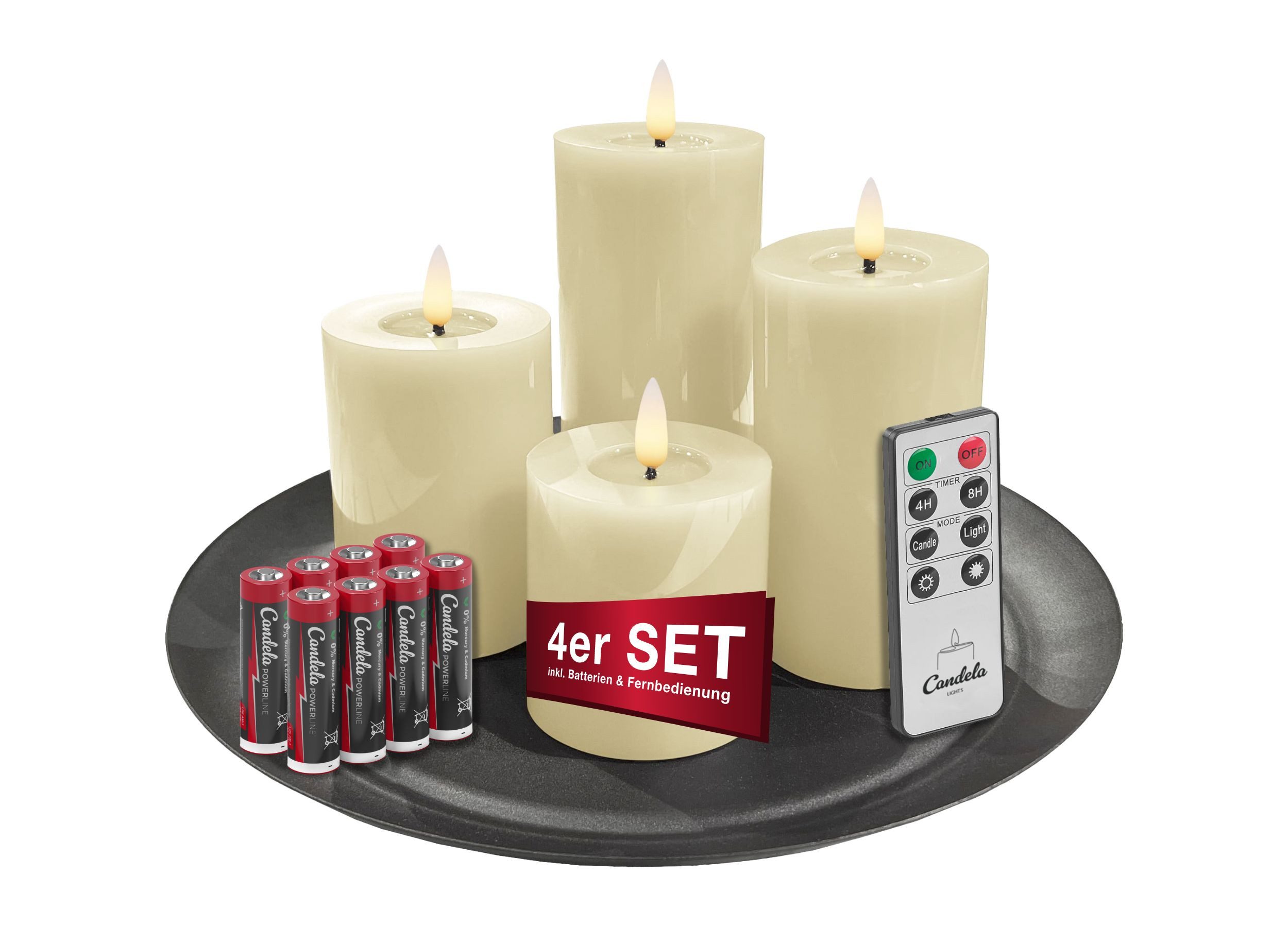 Candela Lights LED Kerzen 4er Set Stumpenkerze inkl. Kerzenteller Echtwachs mit Fernbedienung Timer Funktion & mehrstufig dimmbar bewegliche Flamme Echtwachskerzen