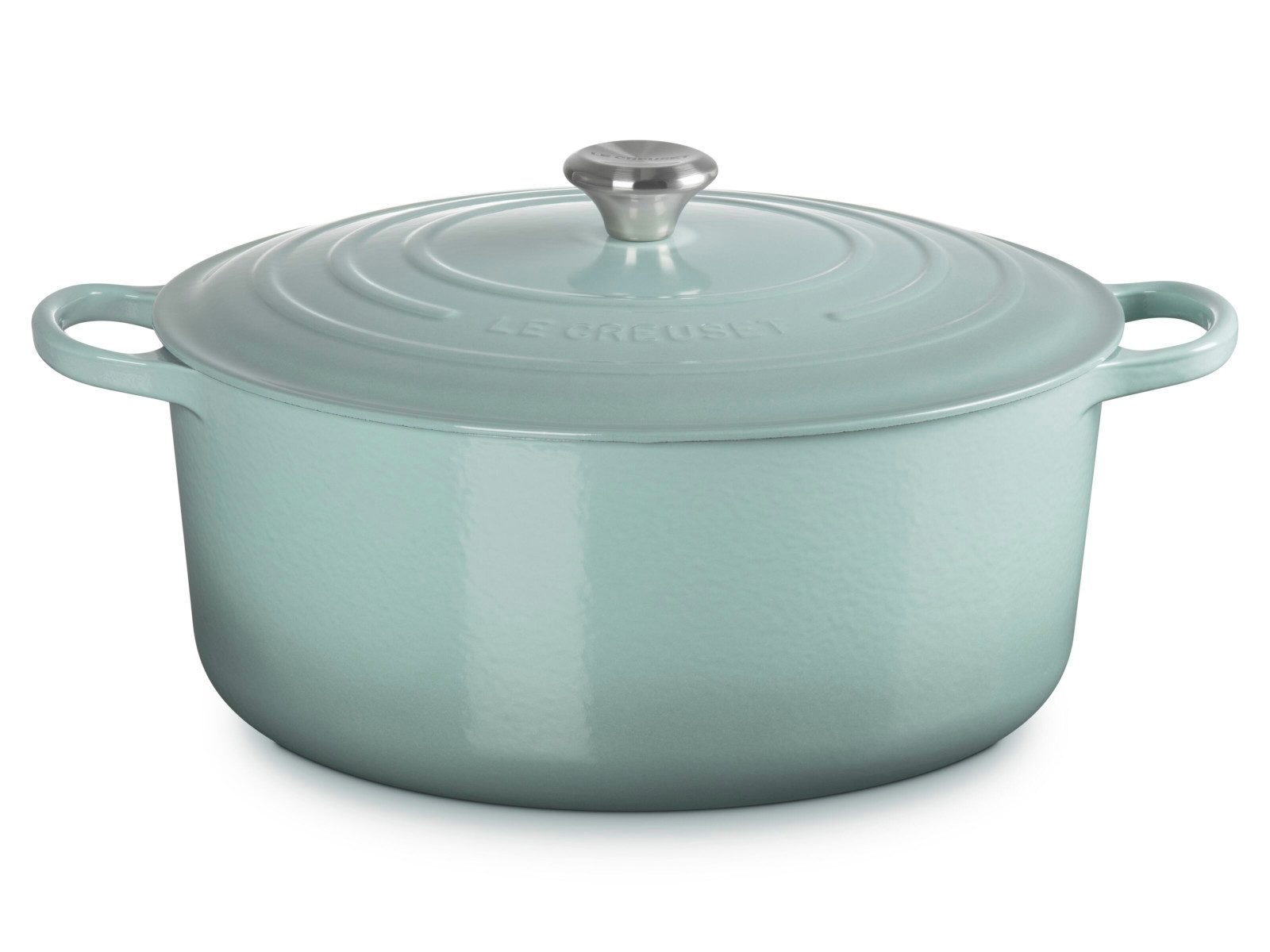 Der runde Bräter Signature von Le Creuset in der Farbe Sea Salt mit 34 cm Durchmesser überzeugt durch sein harmonisches, sanftes Blau und eine hochwertige Verarbeitung aus emailliertem Gusseisen. Das Material verteilt die Wärme gleichmäßig und speichert sie besonders gut, sodass Schmorgerichte, Braten, Suppen und Aufläufe aromatisch und zart gelingen. Die robuste Emaille im Inneren ist geschmacksneutral, widerstandsfähig und ermöglicht ein zuverlässiges Anbraten ohne Anhaften. Der Bräter ist für alle Herdarten geeignet, einschließlich Induktion, und kann ebenso im Backofen genutzt werden. Dank seiner strapazierfähigen Beschichtung ist er sogar spülmaschinengeeignet, was die Reinigung besonders unkompliziert macht. Mit seiner großzügigen Größe bietet er ausreichend Platz für Familiengerichte und das Kochen für mehrere Gäste.