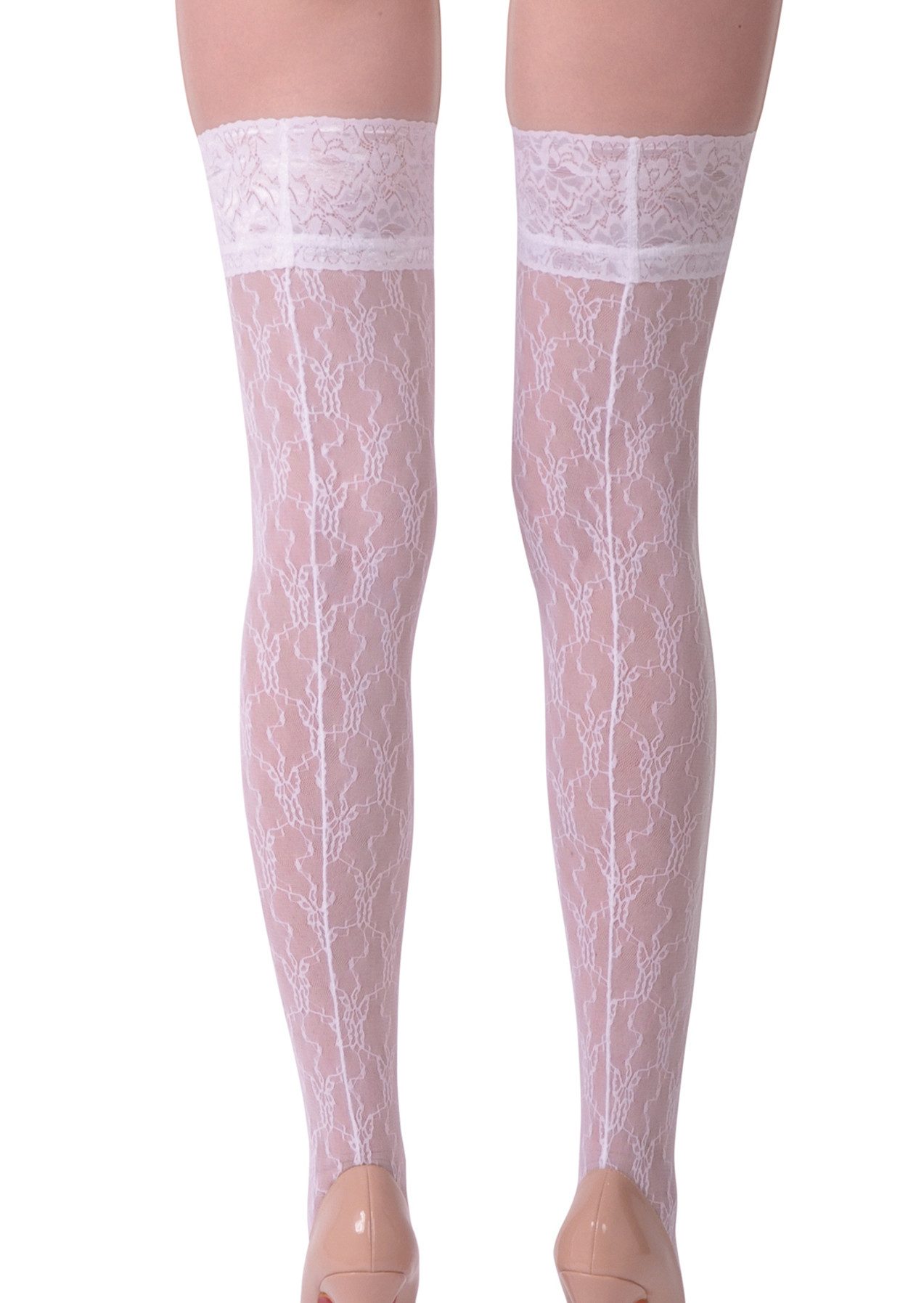 Halterlose Nahtstrümpfe gefertigt aus Netzstoff und Spitzenabschluss als Blumenmuster und Kringel-Muster, mit zwei Silikonstreifen innenseitig.Der Artikel ist in einer Hochglanzverpackung verpackt.Pflegehinweis : 30Grad Handwäsche.Farbe : weiß.Material : 82% Polyamid / 18% Elastan.erhältliche Größen : T1/2, T3/4, T5/6