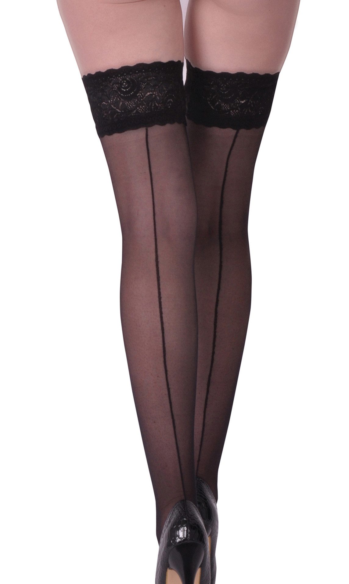 Halterlose Nahtstrümpfe gefertigt aus Netzstoff und Spitzenabschluss als Blumenmuster, mit zwei Silikonstreifen innenseitig.Der Artikel ist in einer Hochglanzverpackung verpackt.20DEN.Pflegehinweis : 30Grad Handwäsche.Farbe : schwarz.Material : 82% Polyamid / 18% Elastan.erhältliche Größen : T1/2, T3/4, T5/6