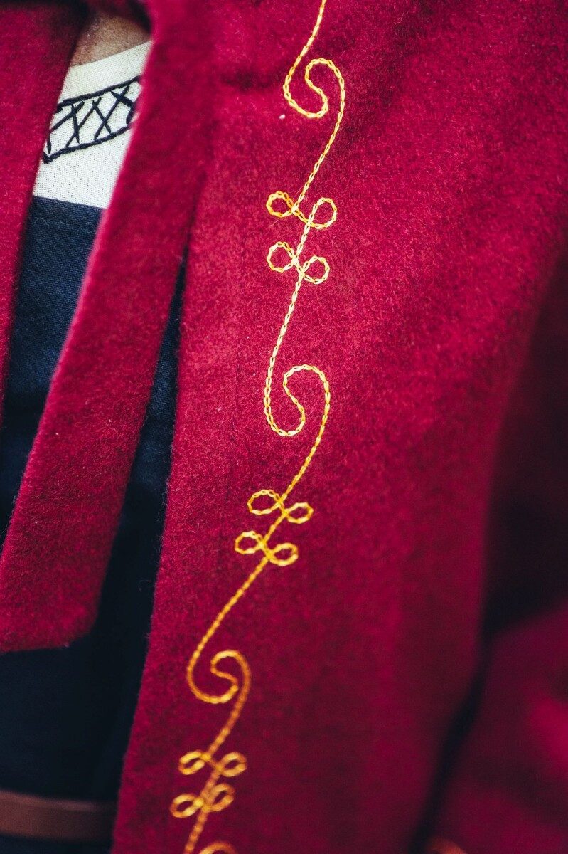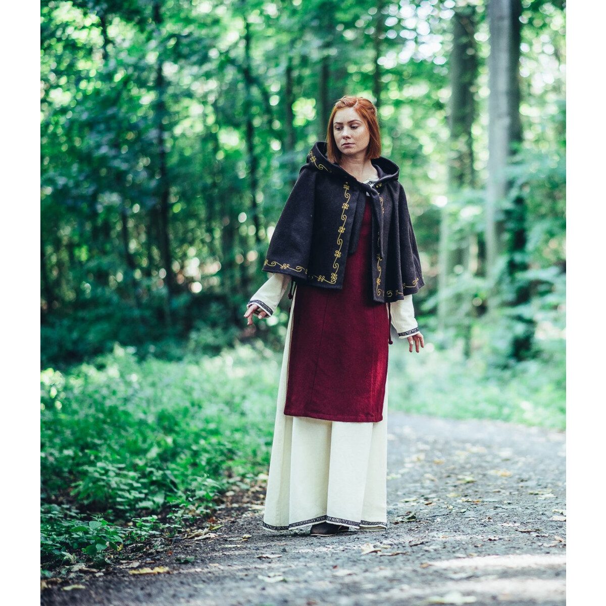 Werte Damen- betrachtet diese wunderschön bestickte mittelalterliche Gugel. Dieses ansehnliche Mittelalter Kleidungsstück zeichnet sich durch seine kunstvoll verzierte Stickerei entlang der Konturen aus. Seine lange, fließende Kapuze bietet nicht nur Schutz vor den Elementen, sondern dient auch als markantes Symbol mittelalterlicher Mode. Mit einer praktischen Bindung an der Vorderseite lässt sich der Gugel leicht anpassen, um Komfort und Stil zu gewährleisten. Die Länge des Gugels, ab der Schulter gemessen, beträgt etwa 46 cm, welche eine elegante Linienführung und eine schmeichelhafte Silhouette schaffen. Der Umfang der Kopföffnung ist mit etwa 75 cm großzügig bemessen und ermöglicht ein einfaches Überstreifen ohne Beeinträchtigung des Haupthaares. Um die Schönheit zu bewahren, empfehlen wir eine Trockenreinigung. Diese mittelalterliche Gugel ist nicht nur eine Kopfbedeckung, sondern ein Stück Geschichte -fühlen Sie sich in der Zeit zurückversetzt.