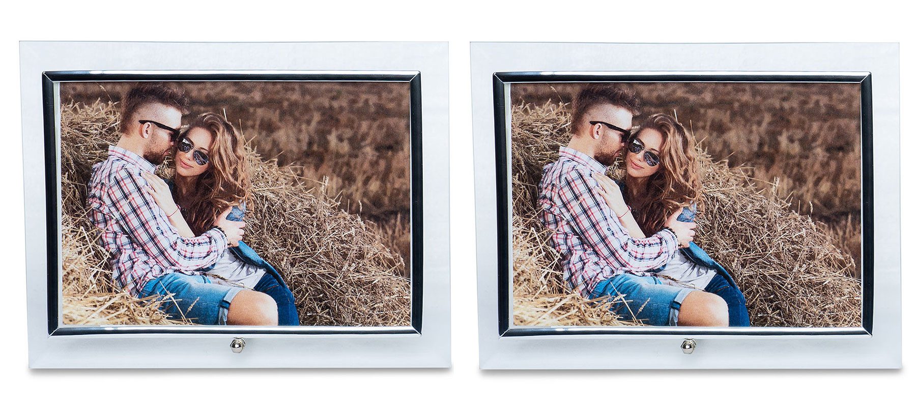 Zwei elegante Bilderrahen aus Glas für die Präsentation besonderer Erinnerungen. Das Set bietet die Möglichkeiten, den Lieblingsmenschen oder ein wichtiges Ereignis stilvoll hervorzuheben. Die hochwertige Glas-Konstruktion mit metallischen Elementen verleiht den Fotos eine moderne Optik und bereichert jedes Sideboard.