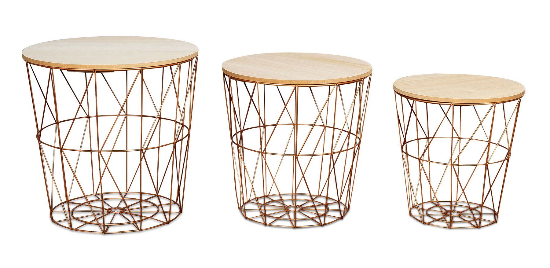 - Größe der Beistelltische: - 1. 39 x 38,5cm 2. 34 x 34,5cm 3. 29 x 31cm - Material: Körbe aus Metall, Deckel aus Mischholz - Drahtkörbe in der Farbe Kupfer mit hellbraunem Deckel - Moderne Couchtische im angesagten Industrial- und skandinavischen Einrichtungsstil - Metallkörbe als stilvolle Dekoelemente, auch als Aufbewahrungsboxen geeignet - Sie bekommen die abgebildeten Tische im 3er Set