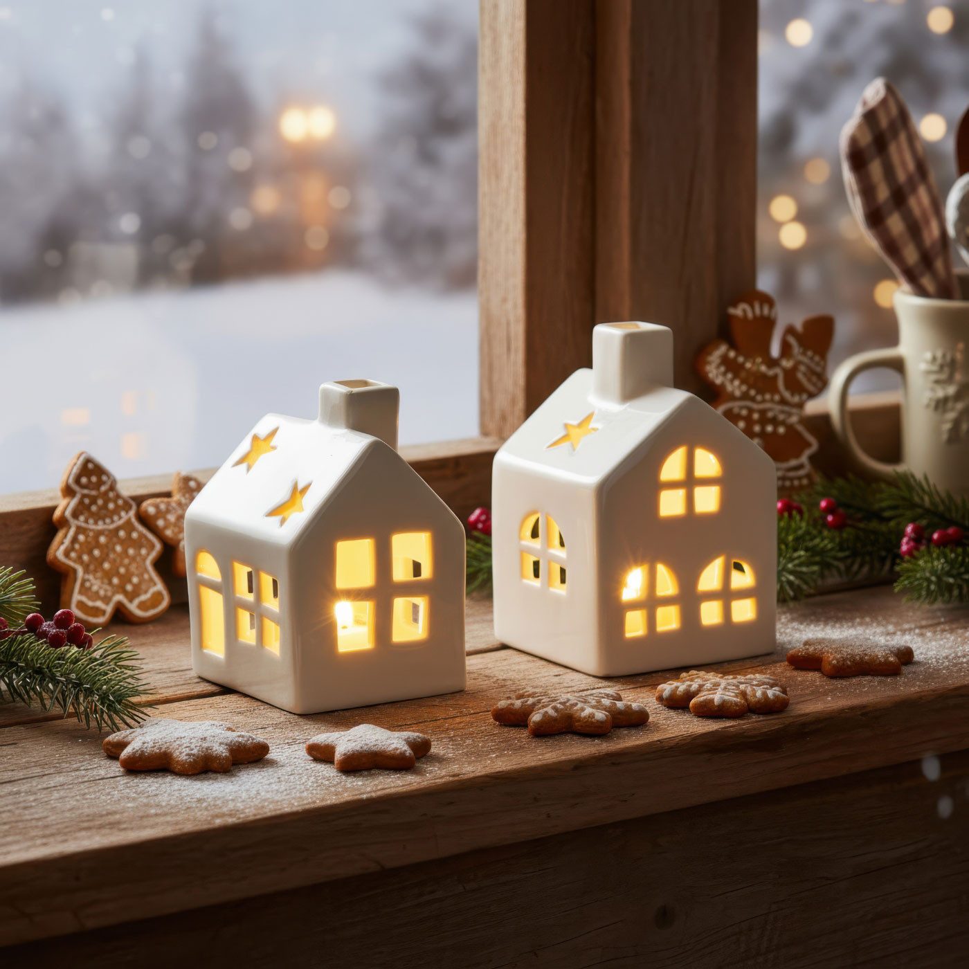 Das 2-teilige Deko-Häuschen aus weißem Porzellan sorgt für eine warme, behagliche Atmosphäre. Auf dem Sideboard, Couchtisch oder als festliche Tischdekoration lassen die Häuschen das Licht stimmungsvoll durch ihre kleinen Fenster scheinen und schaffen ein gemütliches Ambiente. Die Häuschen setzen sowohl einzeln als auch im Ensemble dekorative Akzente und lassen sich saisonal z.B. zu Weihnachten oder ganzjährig einsetzen.