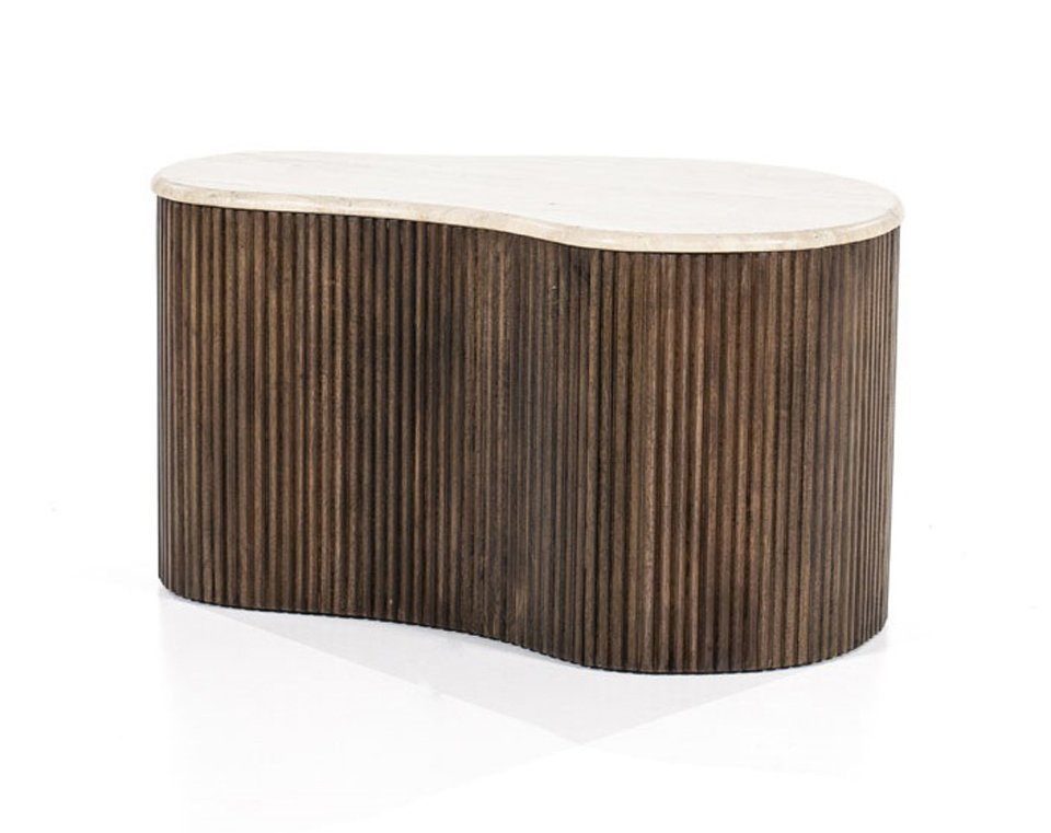 Der Couchtisch LARIE hat eine wunderschöne Travertintischplatte in organischer Form. Travertin ist ein Kalkstein: ein Naturprodukt mit einzigartigen Details und Linien. Darunter sorgt ein Sockel mit Dutzenden von Latten aus Holz für einen stimmungsvollen Effekt.