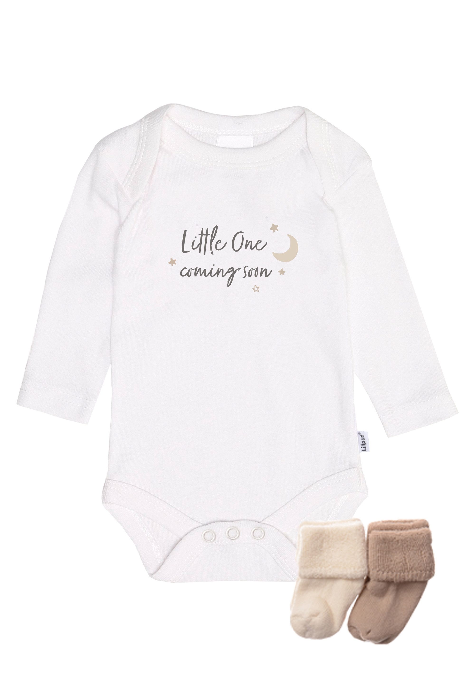 Dieses liebevoll zusammengestellte Set von Liliput ist die perfekte Wahl für werdende Eltern oder ein zartes Geschenk zur Geburt. Es enthält einen weißen Langarmbody aus weicher Baumwolle mit dem emotionalen Schriftzug „Little one coming soon“ – ideal, um eine Schwangerschaft auf stilvolle Weise zu verkünden. Zwei Paar farblich abgestimmte Baby-Söckchen in sanften Beige- und Brauntönen runden das Set harmonisch ab. Dank hautfreundlicher Materialien und liebevoller Gestaltung eignet sich das Set wunderbar als erstes Outfit, Babyparty-Geschenk oder Überraschung für den werdenden Papa.