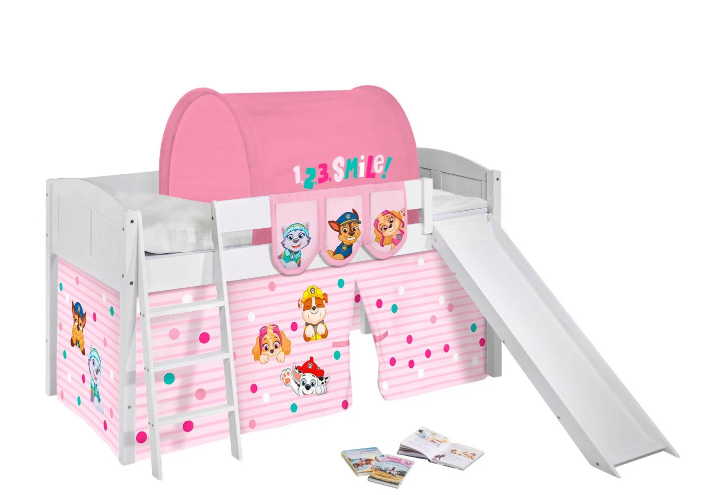 Lilokids Hochbett zum Spielen, Schlafen und Träumen. Dieses halbhohe, zeitlose Kinderbett IDA mit Rutsche der Marke LILOKIDS ist der Liebling aller Kinder und Eltern. Für das Systembett können separate Umbausets erworben werden, um aus dem Halbhochbett ein Hochbett, ein Jugendbett oder ein L-Etagenbett zu machen. Durch den Vorhang von "PAW PATROL" lädt unser Spielbett IDA nicht nur zum Träumen, sondern auch zum Spielen ein und weckt die Fantasie Ihres Kindes. Die Leiter und die Rutsche können beidseitig montiert werden, damit das Bett perfekt in jedes Kinderzimmer gestellt werden kann. Die breiten Trittstufen mit der leicht schrägen Leiter sorgen für einen angenehmen und sicheren Aufstieg. Die Rutsche und der Vorhang sind inklusive. Bitte beachten Sie, dass unsere weiteren Accessoires wie Tunnel, Taschen, Hängeregal, Lattenrost, Matratze und Dekoration nicht im Lieferumfang enthalten sind. Dieses Zubehör können Sie separat hinzubestellen. Bei Kindermöbeln sollten Sie besonders auf die Sicherheit Ihres Kindes achten. Die Absturzsicherung sowie die Pfostenstärke von 54x54 machen IDA zu einer kindersicheren Sache. Wir gewähren für alle LILOKIDS-Betten eine robuste Konstruktion und gute Verarbeitung gemäß den Normen EN 747:2015 für Kinderhoch- und Etagenbetten. Produktdetails: Material: Massivholz Kiefer Farbe: weiß lackiert Liegefläche: 90 x 200 cm Außenmaß (HxBxL): ca. 113 x 210 x 208 cm Pfostenstärke: 5,4 x 5,4 cm Nischenhöhe: ca. 71 cm Vorhang aus 100% Polyester (bei 30°C waschbar) rundum Absturzsicherung und Leiter