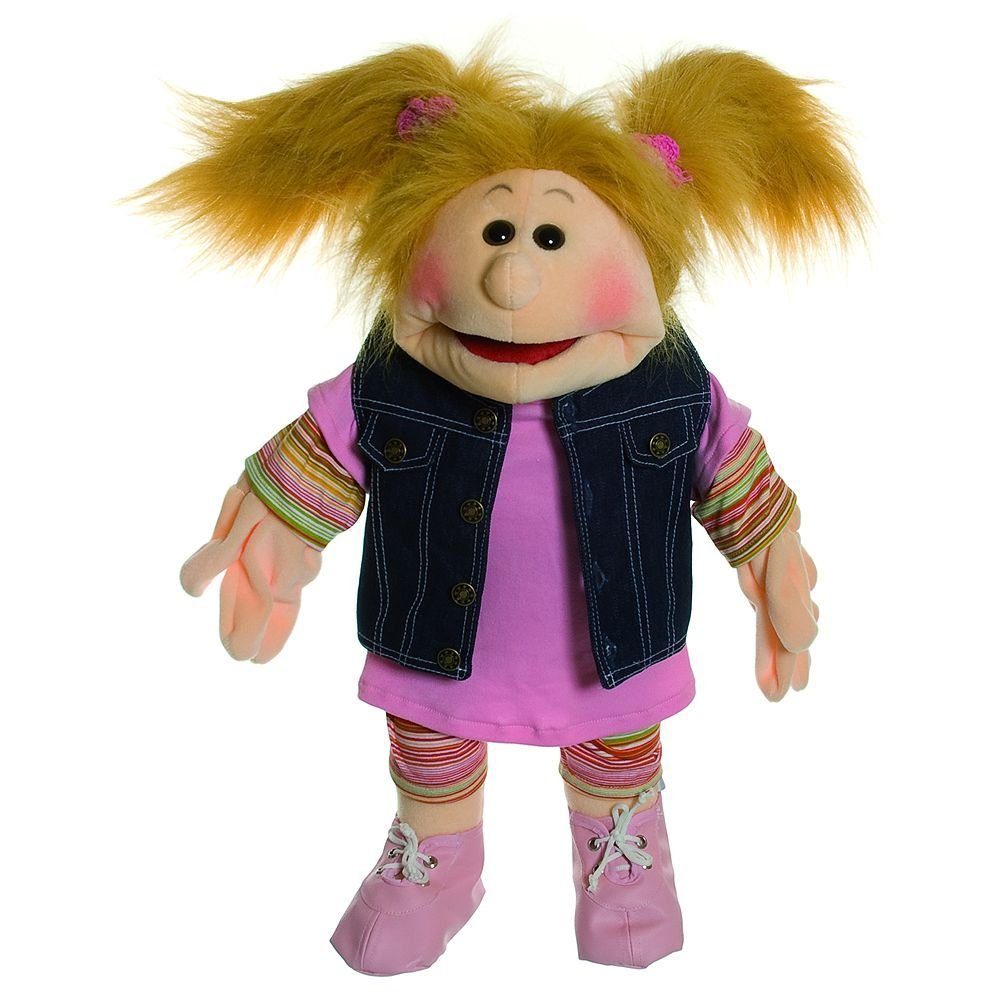 Die Handpuppe Fibi 45cm W409 von Living Puppets® ist ein kleines Mädchen zum lieb haben. Ihre blonden Haare sind zu zwei schönen Zöpfen gebunden. Sie hat ein Ringelshirt und eine Ringelhose an. Über ihrem rosa Kleidchen trägt Fibi eine Jeansweste.Jeansweste, Hose und rosa Schuhe sind ausziehbar. Leichte Bespielbarkeit des Mundes durch das "Klappmaul"-Prinzip. Eingang auf der Rückseite des Kopfes. Alle Handzugänge sind so bemessen, dass die Figur für Kinder und kleine Erwachsenenhände gleichermaßen gut bespielbar ist. - für Kinder ab 10 Monate geeignet.- Größe ca.: 45 cm- bei 30°C im Schonwaschgang waschbar. Sicherheitshalber wäre die Zugabe von "Farbfangtüchern" (in Drogeriemärkten erhältlich) ratsam.