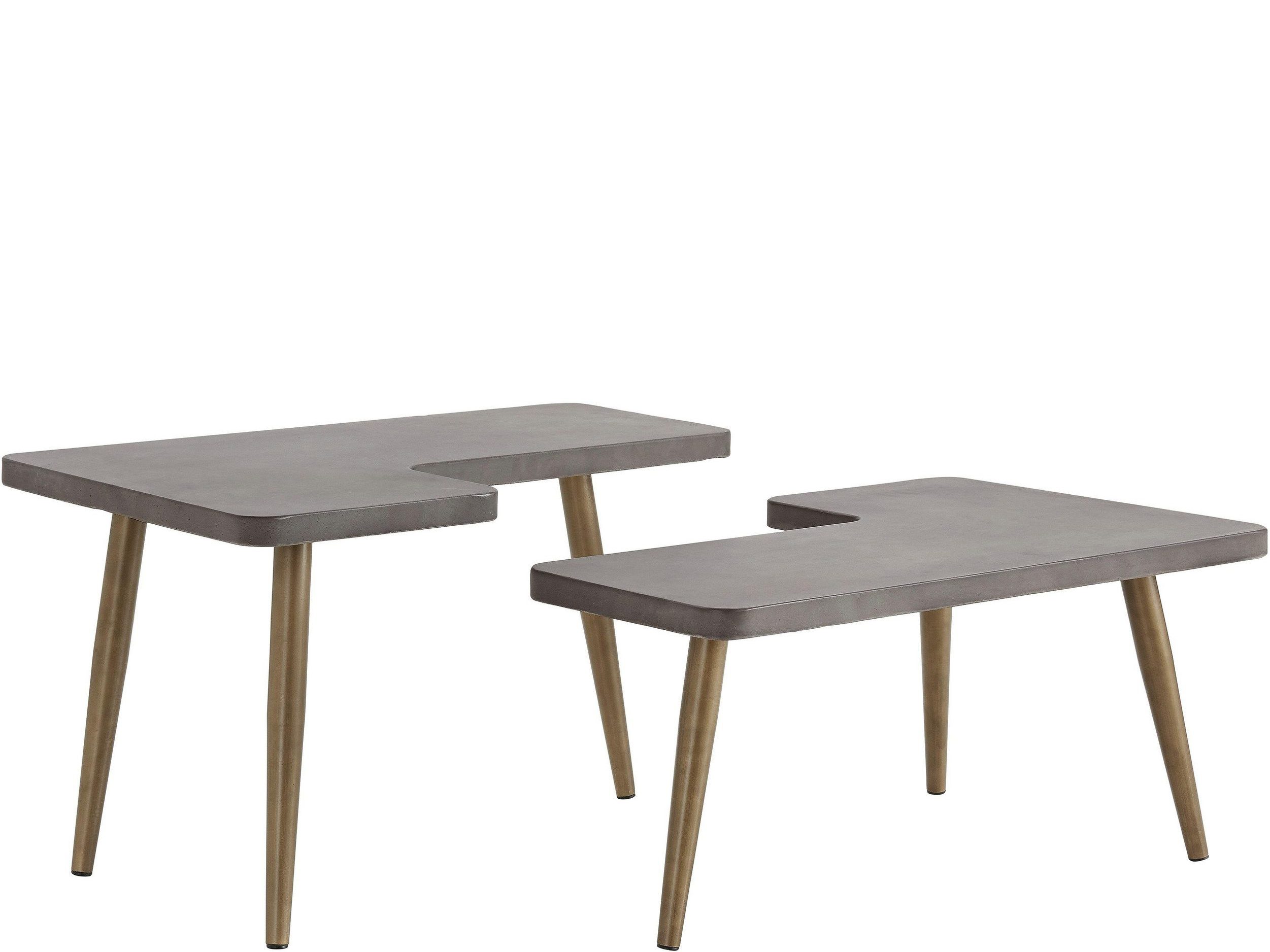 Die trendigen Wohnzimmertische »Luque« zeichnen sich durch ein ansprechendes Design mit modernen Elementen aus. Für einen ansprechenden Kontrast in Farbe und Material sorgt das dezent ausgestellte 3 Fuß-Gestell, das aus Messing gefertigt ist. Die beiden Tische verfügen über unterschiedliche Maße, sodass der Beistelltisch unter den Sofatisch geschoben werden kann, wodurch die Möbel ein ansprechendes Ensemble bilden. Die rechteckigförmige Tischplatte ist aus Beton hergestellt und sorgt für Ablagefläche im Wohnbereich.