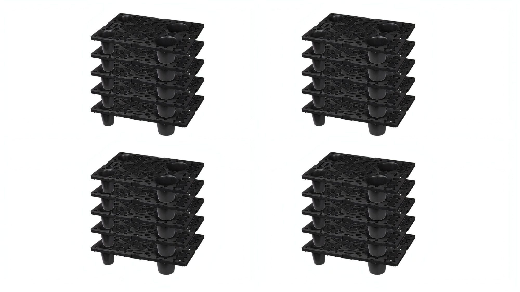 Set mit 20 Displaypaletten im Viertelpalettenmaß 600 x 400 mm für Warenpräsentation, Bereitstellung und Transport. Jede Palette aus Polypropylen mit offenem Deck und vier Füßen, Farbe Schwarz und ohne Antirutschkante. Außenmaß je Palette 600 x 400 x 125 mm, Gewicht ca. 1 kg, Traglast 150 kg statisch und 75 kg dynamisch. Die Paletten sind stapelbar und passen zu Kisten und Kartons im 600 x 400 Format – geeignet für POS-Flächen, Kommissionierung und Lager.