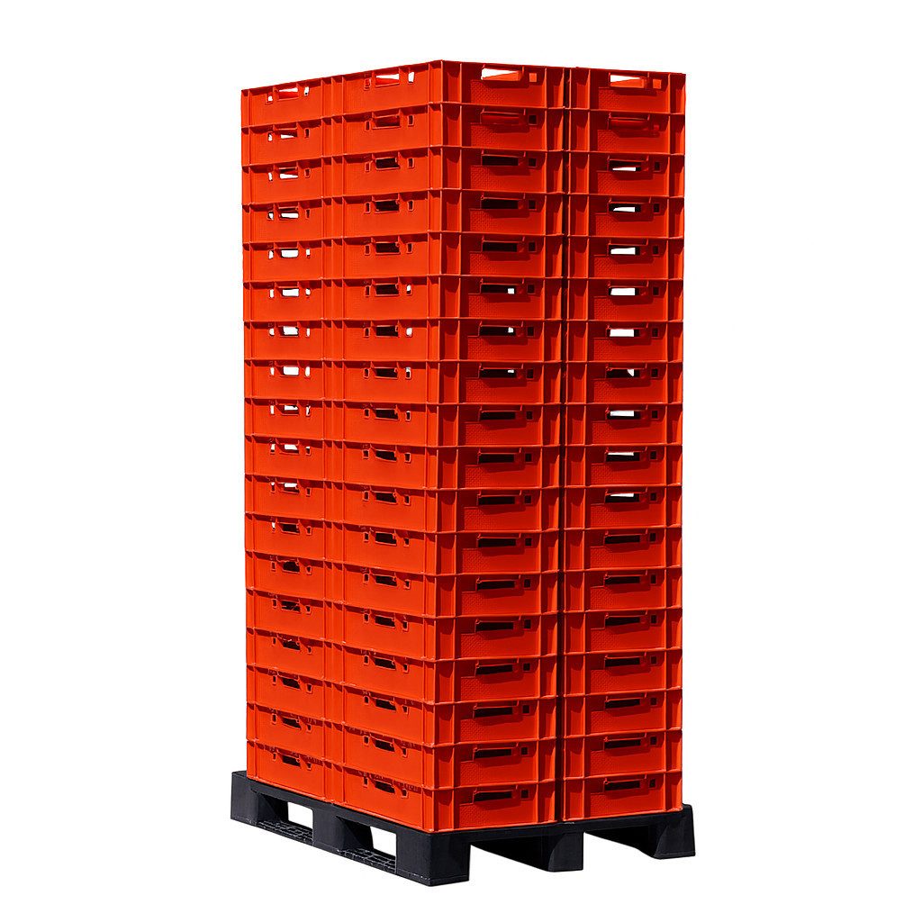 Merkmale: stapelbar, 4 Handgriffe, Noppen- und Barcodefelder, glatte Innenflächen, Boden und Seiten geschlossen