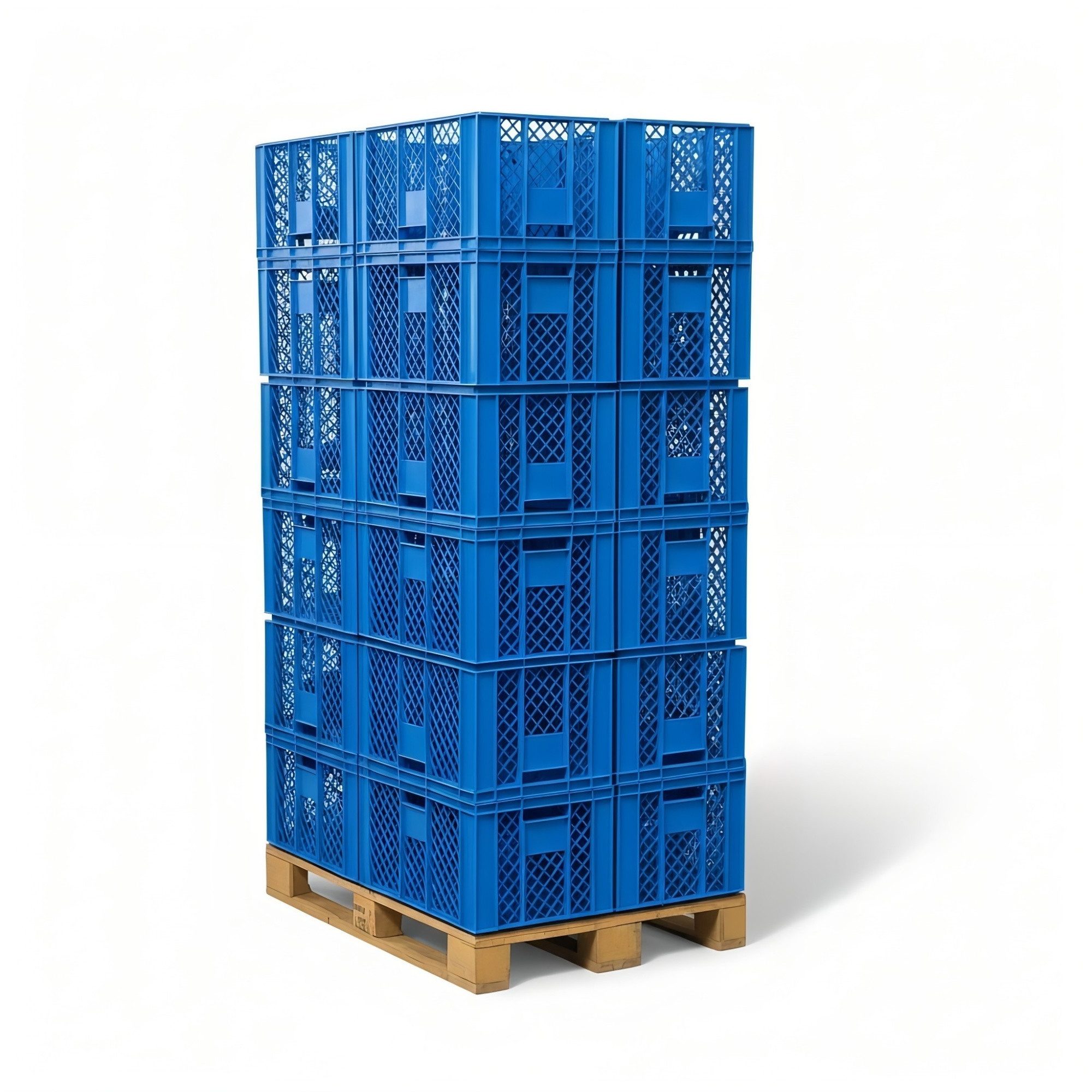 Set aus 36 blauen Bäckerkisten mit den Maßen 600 x 400 x 320 mm für Lagerung und Transport von Backwaren. Die Kisten bestehen aus lebensmittelechtem HDPE und verfügen über durchbrochene Seitenwände und einen gelochten Boden für gute Luftzirkulation. Sie lassen sich stabil übereinanderstapeln und unterstützen einen übersichtlichen Warenfluss in Produktion und Lager. Geeignet für Bäckereien, Konditoreien, Lebensmittelhersteller, Großküchen und Lagerlogistik, überall dort, wo Backwaren, Teiglinge oder Lebensmittel sicher und hygienisch befördert und aufbewahrt werden müssen.