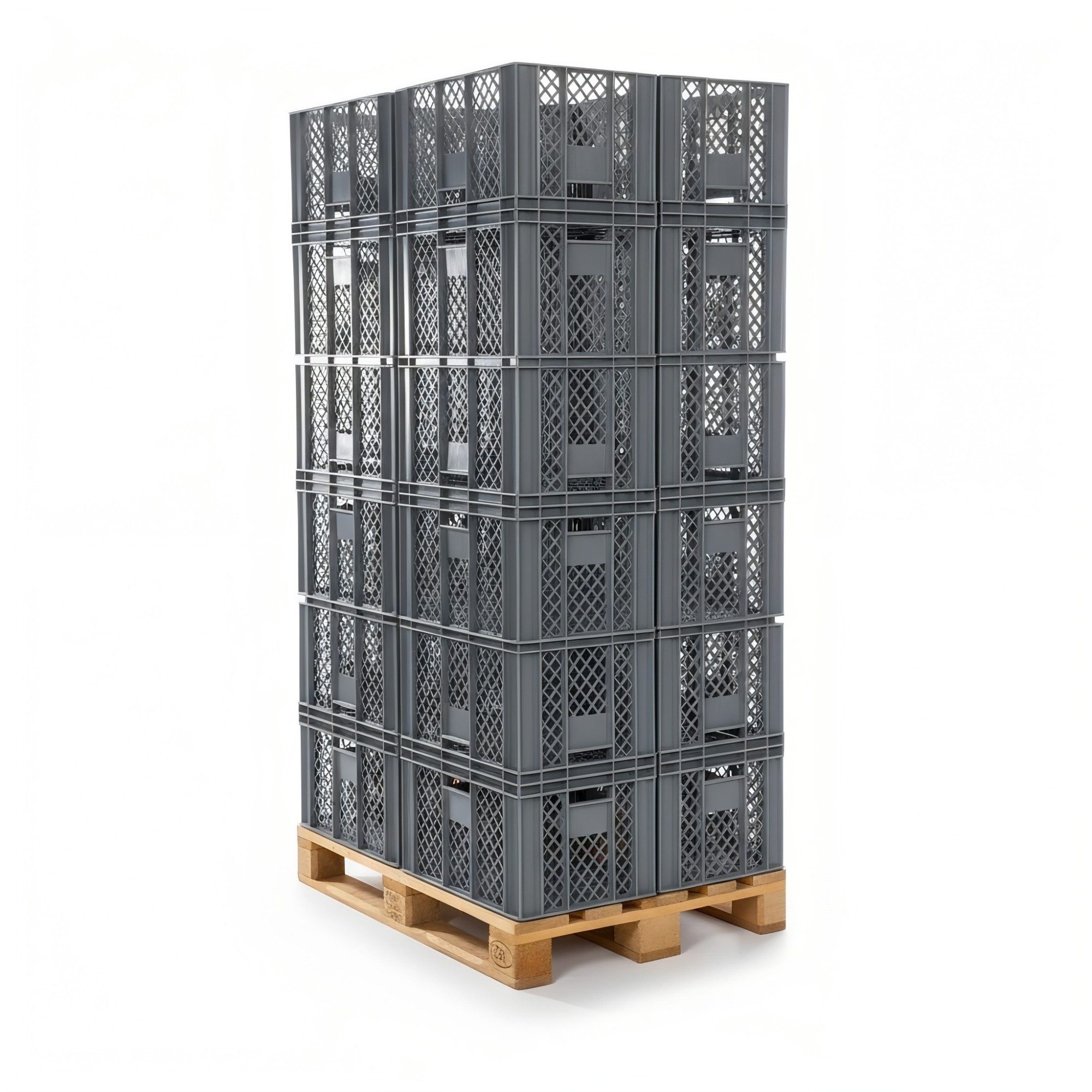 Set aus 36 graue Bäckerkisten mit den Maßen 600 x 400 x 320 mm für Lagerung und Transport von Backwaren. Die Kisten bestehen aus lebensmittelechtem HDPE und verfügen über durchbrochene Seitenwände und einen gelochten Boden für gute Luftzirkulation. Sie lassen sich stabil übereinanderstapeln und unterstützen einen übersichtlichen Warenfluss in Produktion und Lager. Geeignet für Bäckereien, Konditoreien, Lebensmittelhersteller, Großküchen und Lagerlogistik, überall dort, wo Backwaren, Teiglinge oder Lebensmittel sicher und hygienisch befördert und aufbewahrt werden müssen.