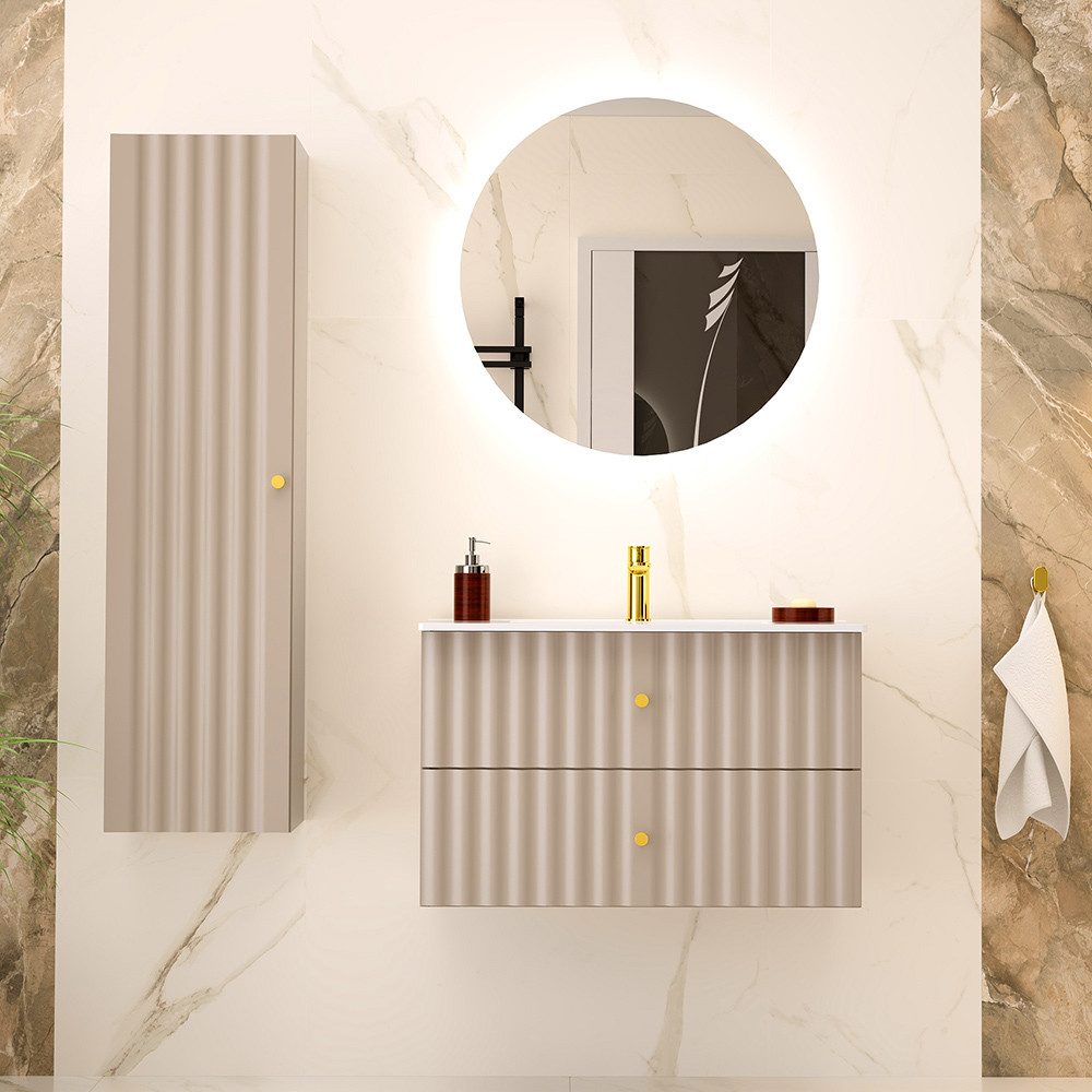Verleihe deinem Badezimmer einen frischen Look mit unserer stilvollen Möbelserie in kaschmir. Die gerillte Front und die goldfarbenen Griffe verleihen den Schränken eine elegante und moderne Note, die für ein edles Ambiente sorgt. Dank der Softclose-Funktion schließen Tür und Schubladen sanft und geräuschlos. Die Möbel bieten außerdem großzügigen Stauraum und setzen gleichzeitig luxuriöse Akzente.