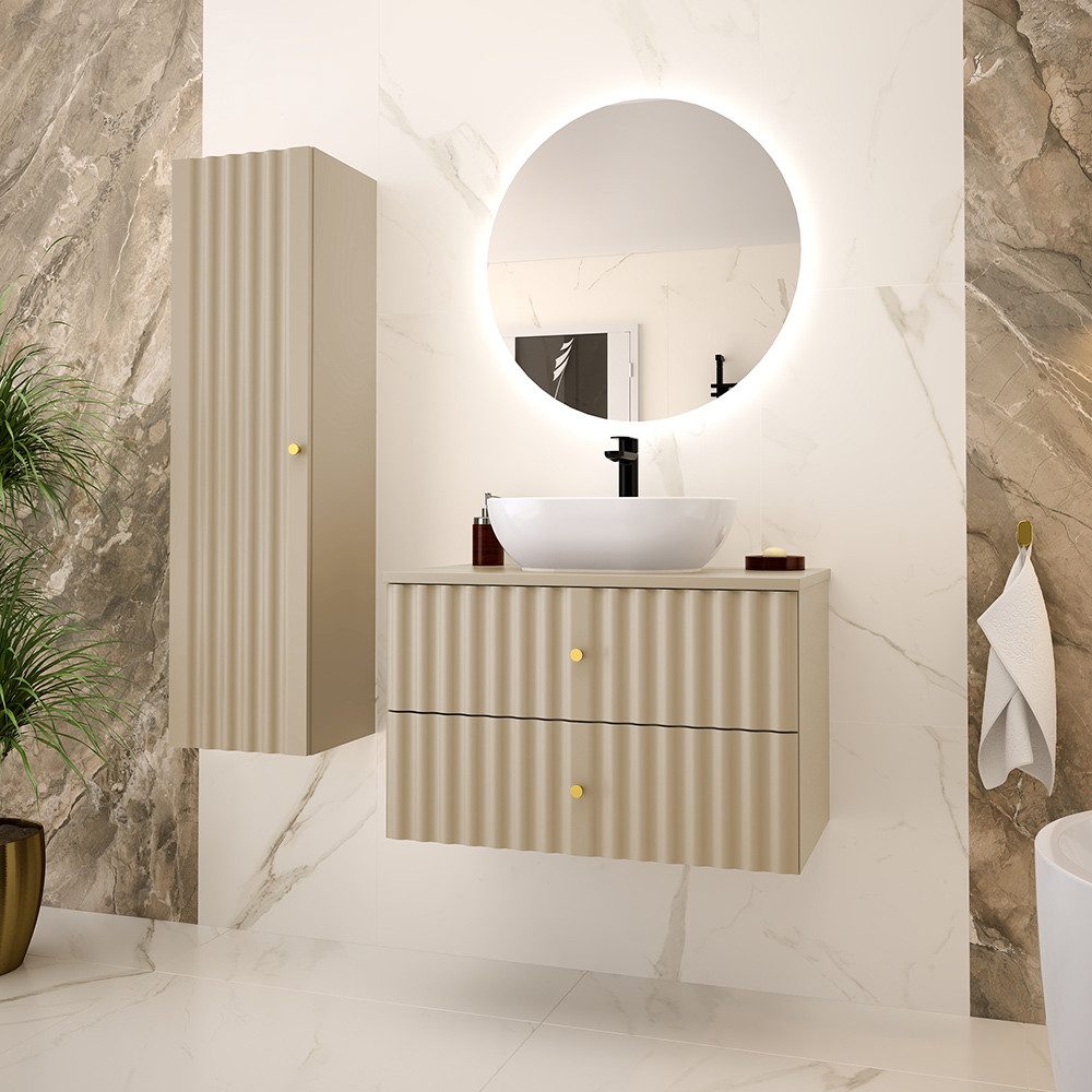 Verleihe deinem Badezimmer einen frischen Look mit unserer stilvollen Möbelserie in kaschmir. Die gerillte Front und die goldfarbenen Griffe verleihen den Schränken eine elegante und moderne Note, die für ein edles Ambiente sorgt. Dank der Softclose-Funktion schließen die Tür und Schubladen sanft und geräuschlos. Die Möbel bieten außerdem großzügigen Stauraum und setzen gleichzeitig luxuriöse Akzente.