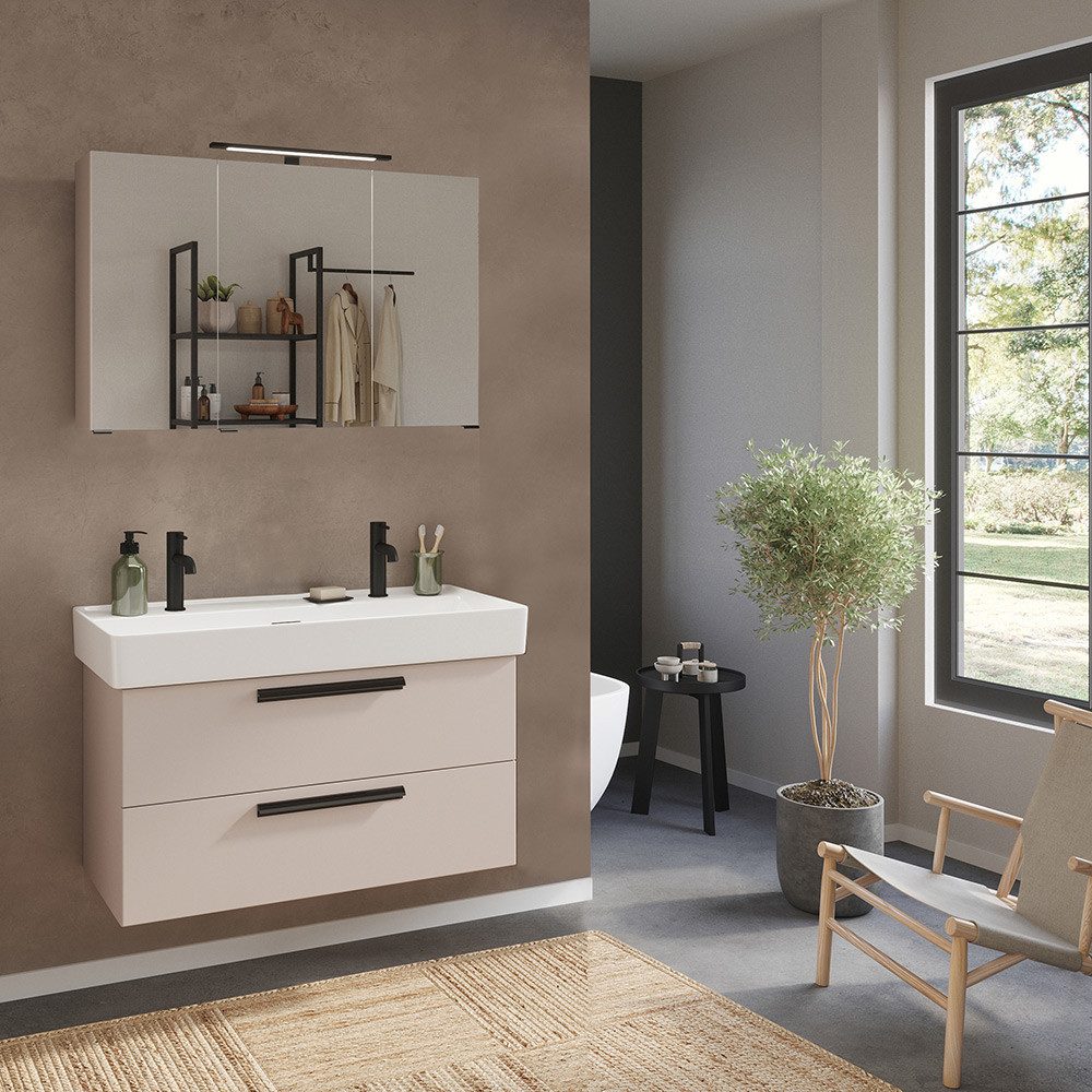 Kompakt, funktional und stilvoll: Das 2-teilige Badmöbel Set überzeugt mit durchdachter Ausstattung und modernem Look. Der Waschtisch mit pflegeleichtem Keramikbecken ist für zwei Armaturen vorbereitet – perfekt für den Alltag zu zweit. Zwei große Softclose-Schubladen bieten Platz für Pflegeprodukte & Badaccessoires. Der dreitürige Spiegelschrank ergänzt das Set mit praktischen Glasböden, integrierter Steckdose, Schalter und LED-Aufbauleuchte – für optimalen Komfort bei jedem Handgriff.