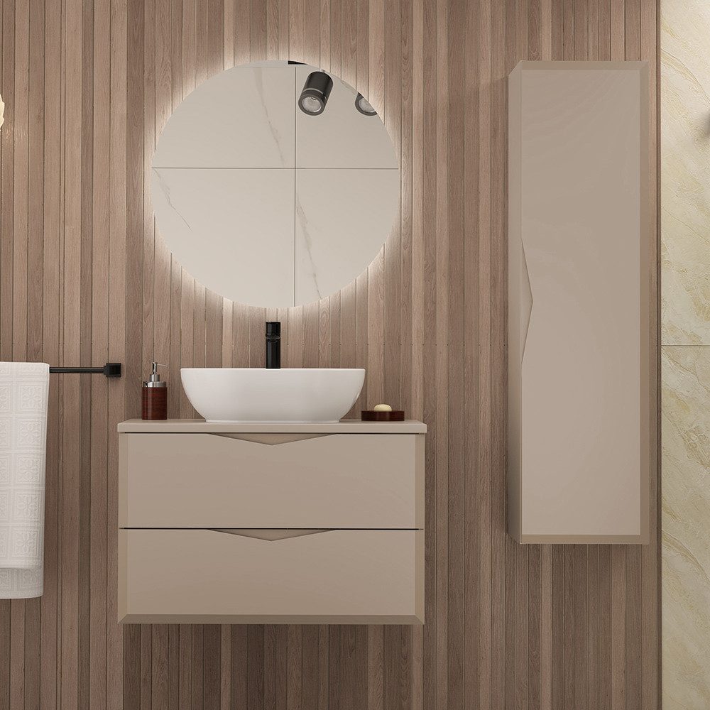Dieses stilvolle Badmöbel-Set bringt modernes Design und praktische Funktionen in dein Badezimmer. Die leicht angeschrägten Fronten, die an einen Facettenschliff erinnern, und das grifflose Design machen die Möbel zu einem echten Blickfang. Dank der pflegeleichten Materialien und der zeitlosen Optik sorgen sie für ein aufgeräumtes und elegantes Ambiente. Genau das Richtige für alle, die Wert auf schöne Details und Alltagstauglichkeit legen.