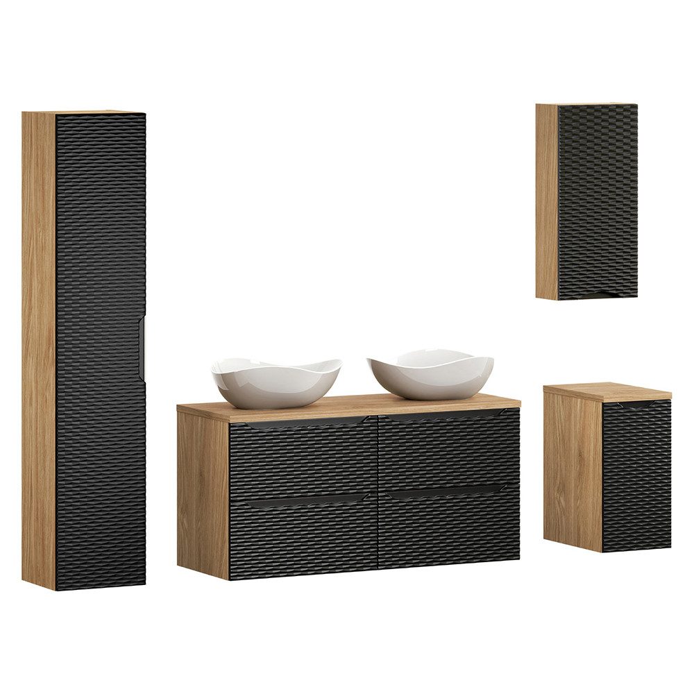 Der Korpus in Eiche und die grifflosen Fronten in schwarz mit einer 3D-Struktur in Wellenoptik bringen einen Hauch von Luxus in dein Badezimmer.