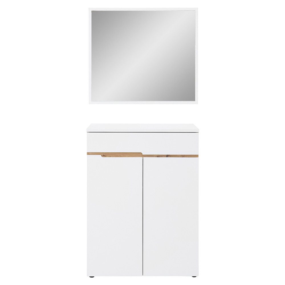 Der Schuhschrank überzeugt mit Stauraum für den Alltag, klarer Formgebung und praktischer Schublade für Kleinteile. Der passende Spiegel bringt Licht und Tiefe in deinen Eingangsbereich. Die Kombination aus matt-weißen Fronten und Artisan Eiche Absetzungen verleiht deinem Flur einen modernen, harmonischen Look.