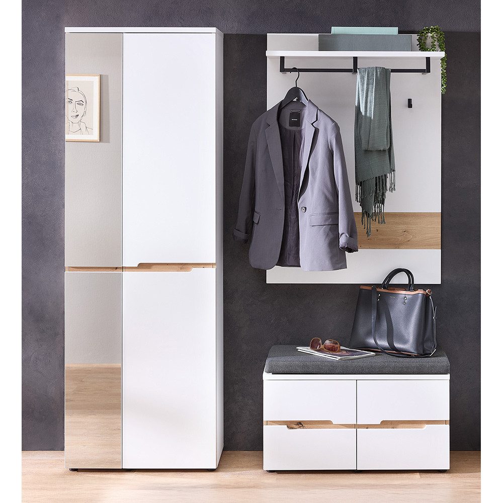 Die matt-weißen Fronten mit warmen Artisan Eiche Absetzungen wirken modern und einladend, während klare Formen und durchdachte Details für Alltagstauglichkeit sorgen. Garderobenschrank, Sitzbank mit Kissen und ein praktisches Paneel mit Kleiderstange und Haken bringen Struktur und Komfort in deinen Flur.