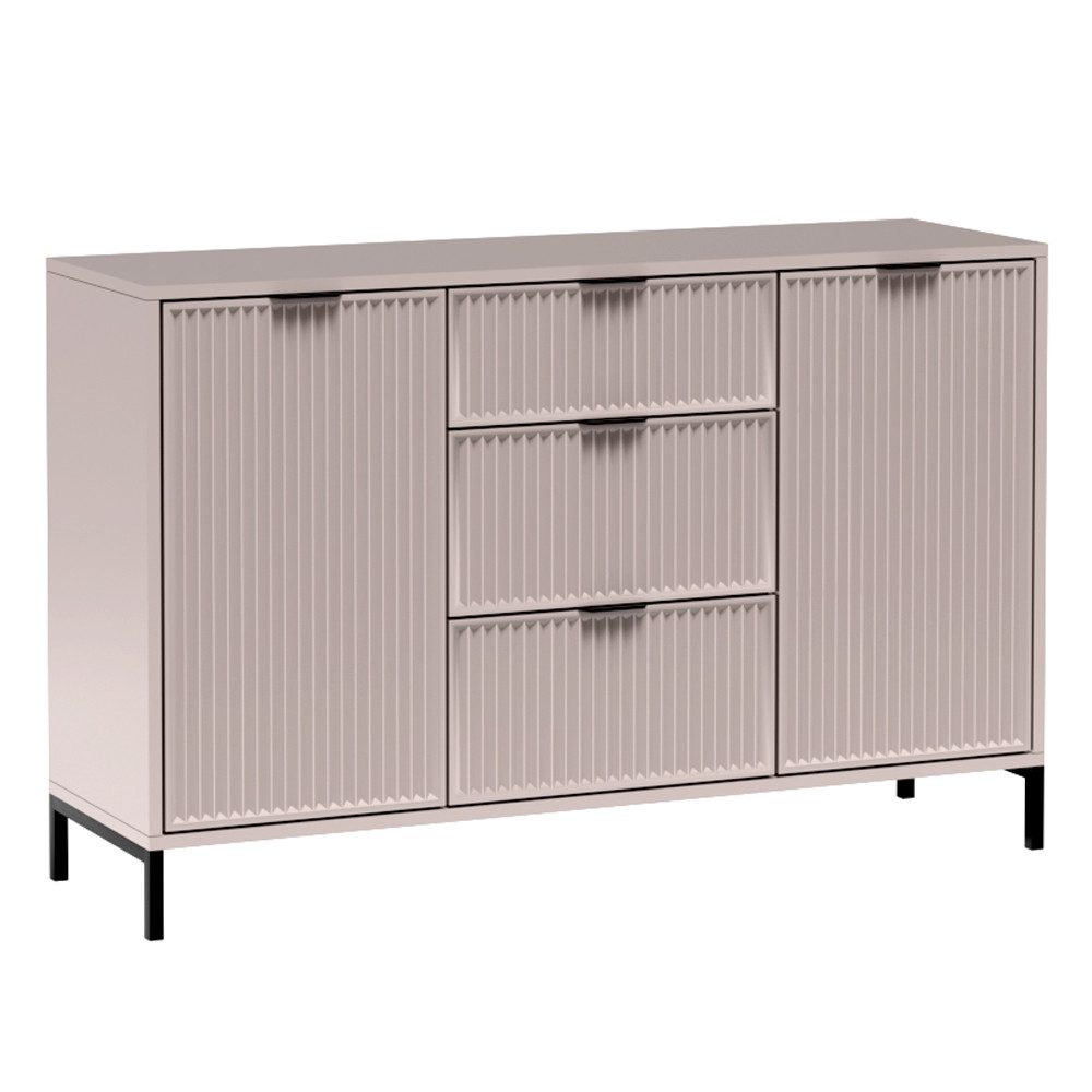 Tauche ein in die Welt der Eleganz und des Komforts! Unsere Wohnmöbel sind in Kaschmir beige oder Indigo blau erhältlich. Die Fronten in Rillenoptik, begleitet von goldfarbenen oder rosegoldfarbenen Griffen und schwarzen Metallfüßen, bieten dir die perfekte Gelegenheit, deine 4-Wände in einen Ort der stilvollen Erholung zu verwandeln.