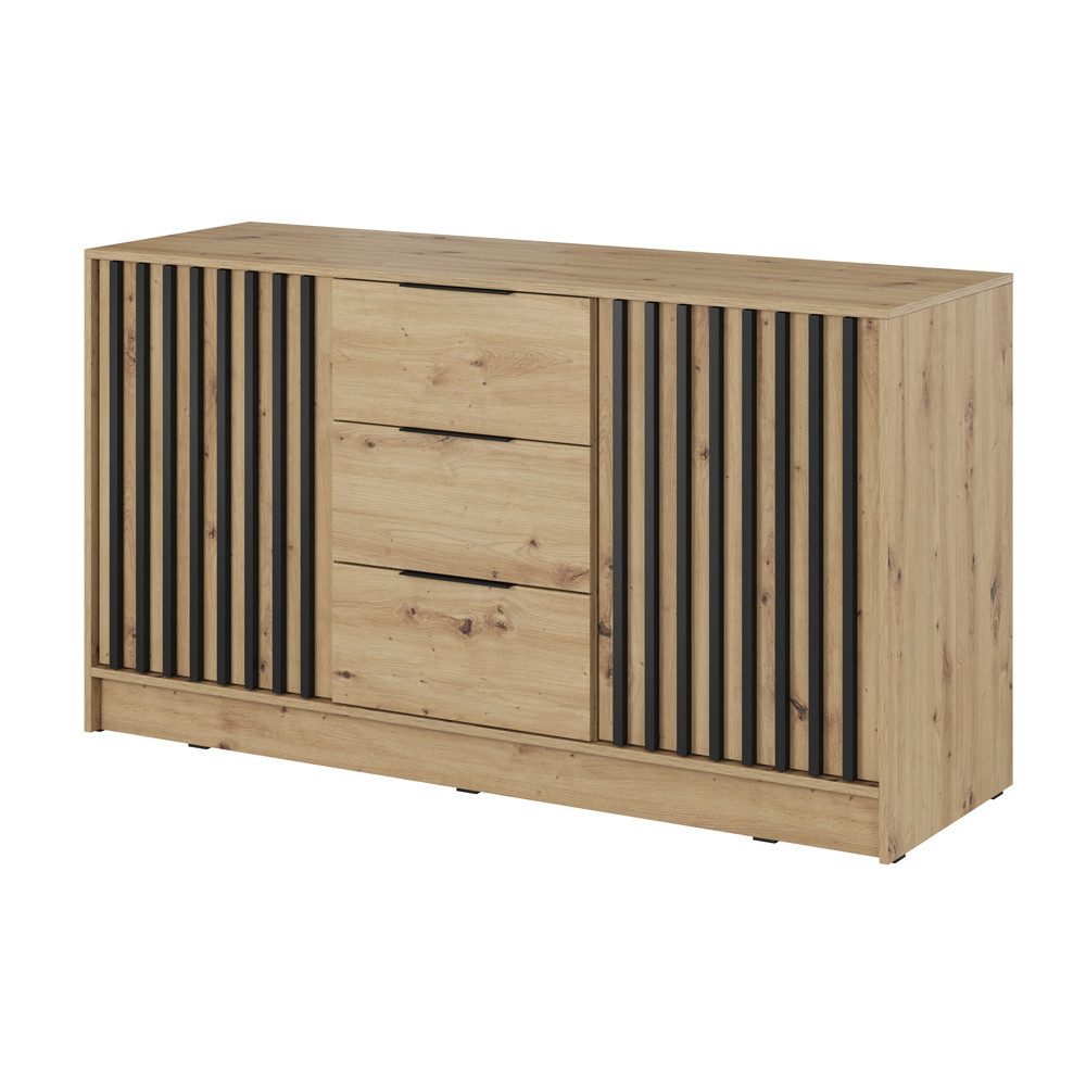 Ein echtes Highlight für dein Zuhause: Das Sideboard in Eiche verbindet natürliche Wärme mit modernem Design. Die markante Lamellenfront in Schwarz zieht die Blicke magisch an und verleiht jedem Raum Tiefe und Charakter. Drei Schubladen und zwei Türen mit Fächern bieten dir viel Platz für Geschirr, Wäsche oder Alltagsdinge. Ob im Schlafzimmer, Wohnzimmer oder Essbereich – dieses Sideboard sorgt für Ordnung mit Stil und bringt trendiges Design in dein Zuhause.