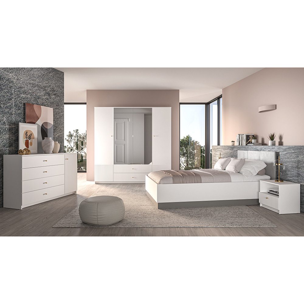 Elegantes Weiß trifft auf goldene Akzente, gerillte Fronten auf weiche Polster. Kommode, Kleiderschrank, Nachttische und Bett bilden ein perfekt abgestimmtes Ensemble. Mit Softclose, Stauraum und Design-Komfort zieht nicht nur Ordnung ein – sondern auch ein neues Lebensgefühl.