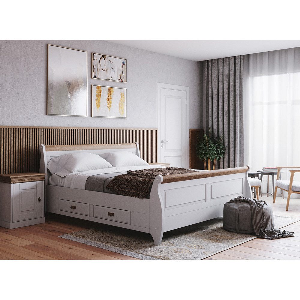 Die natürliche Holzoptik setzt warme Akzente, während das Bett mit vier Schubladen praktischen Stauraum bietet. Die harmonische Kombination aus weißer Oberfläche und naturfarbener Deckplatte schafft ein modernes, freundliches und hochwertiges Ambiente.