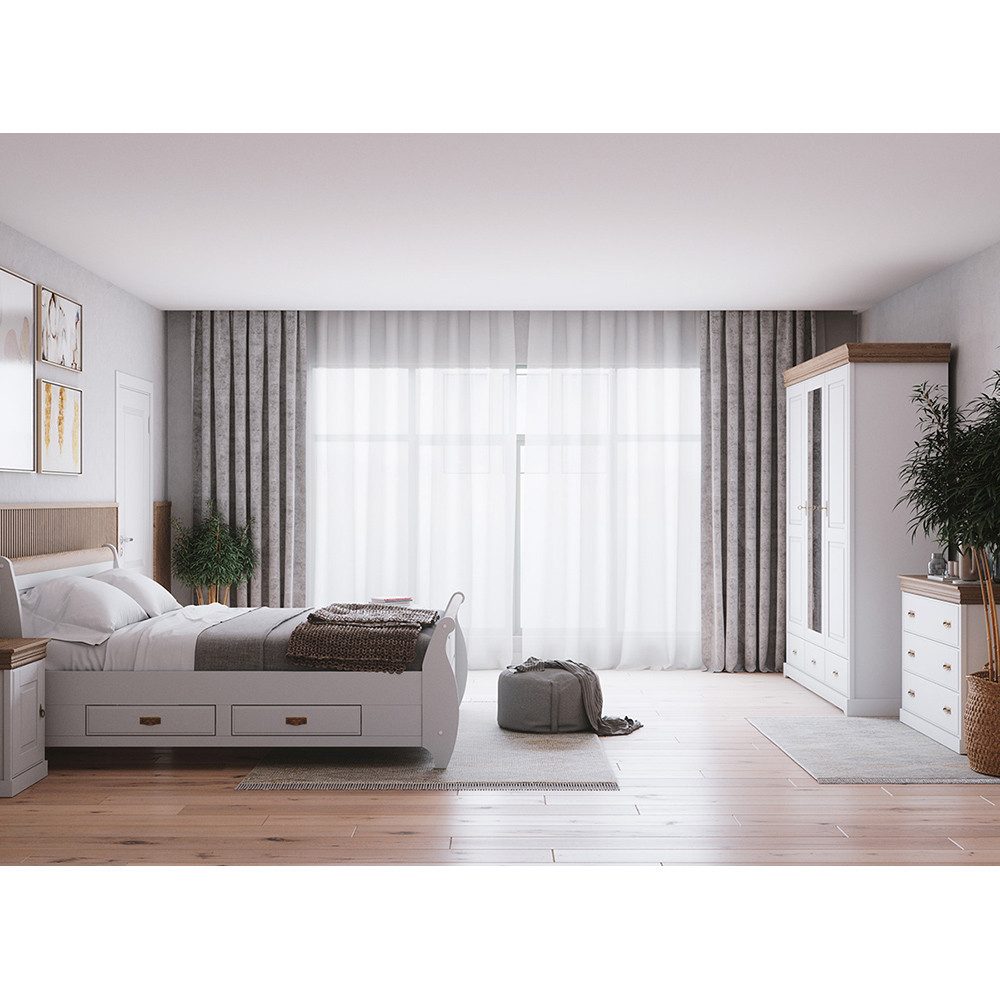 Das 180 cm Bett bietet dank vier Schubladen großzügigen Stauraum, während zwei passende Nachttische und eine geräumige Kommode zusätzlichen Platz für persönliche Gegenstände schaffen. Der Kleiderschrank ergänzt das Ensemble mit praktischen Ablageflächen und einer Kleiderstange.