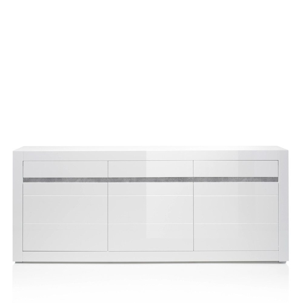 Mit dieser ultra modernen Wohnzimmer-Möbel-Serie COGO-61 mit Fronten in weiß Hochglanz und einmaligen Griffmulden / Zierleisten in Betonoptik liegen Sie im Trend und verleihen Ihrer Wohnung ein elegantes Erscheinungsbild. Die Oberflächen sind pflegeleicht, die Möbel bieten viel Stauraum und Türen als auch Schubladen sind mit Soft-Close-System ausgestattet.