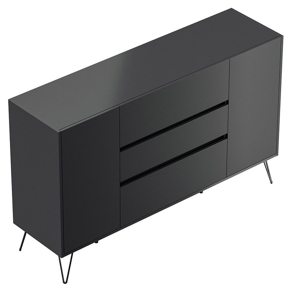 Zeitlos, klar und funktional: Dieses Sideboard in edlem Graphit bringt moderne Ruhe und perfekte Organisation in Dein Zuhause. Zwei Türen mit festen Böden und drei grifflose Schubladen bieten Dir vielseitigen Stauraum – ideal für Geschirr, Textilien oder Alltagsdinge. Softclose sorgt für sanftes, leises Schließen, filigrane Metallfüße für eine schwebende, elegante Wirkung.