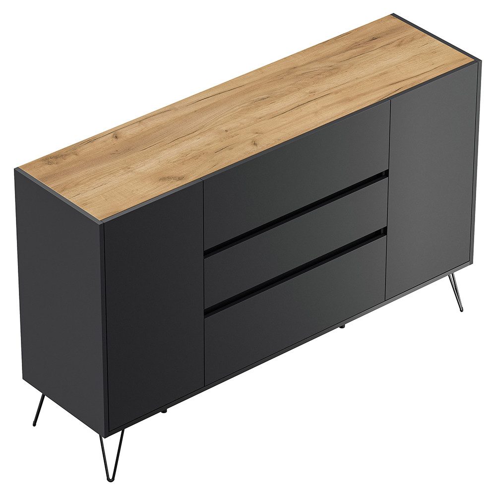 Dieses Sideboard kombiniert weißen Hochglanz mit Eiche-Nachbildung – für eine moderne Einrichtung mit wohnlicher Wärme. Zwei Türen mit festen Böden und drei grifflose Schubladen bieten strukturierten Stauraum für Alltagsgegenstände, Unterlagen oder Deko. Softclose sorgt für leises Schließen, filigrane Metallfüße für eine elegante, luftige Optik.