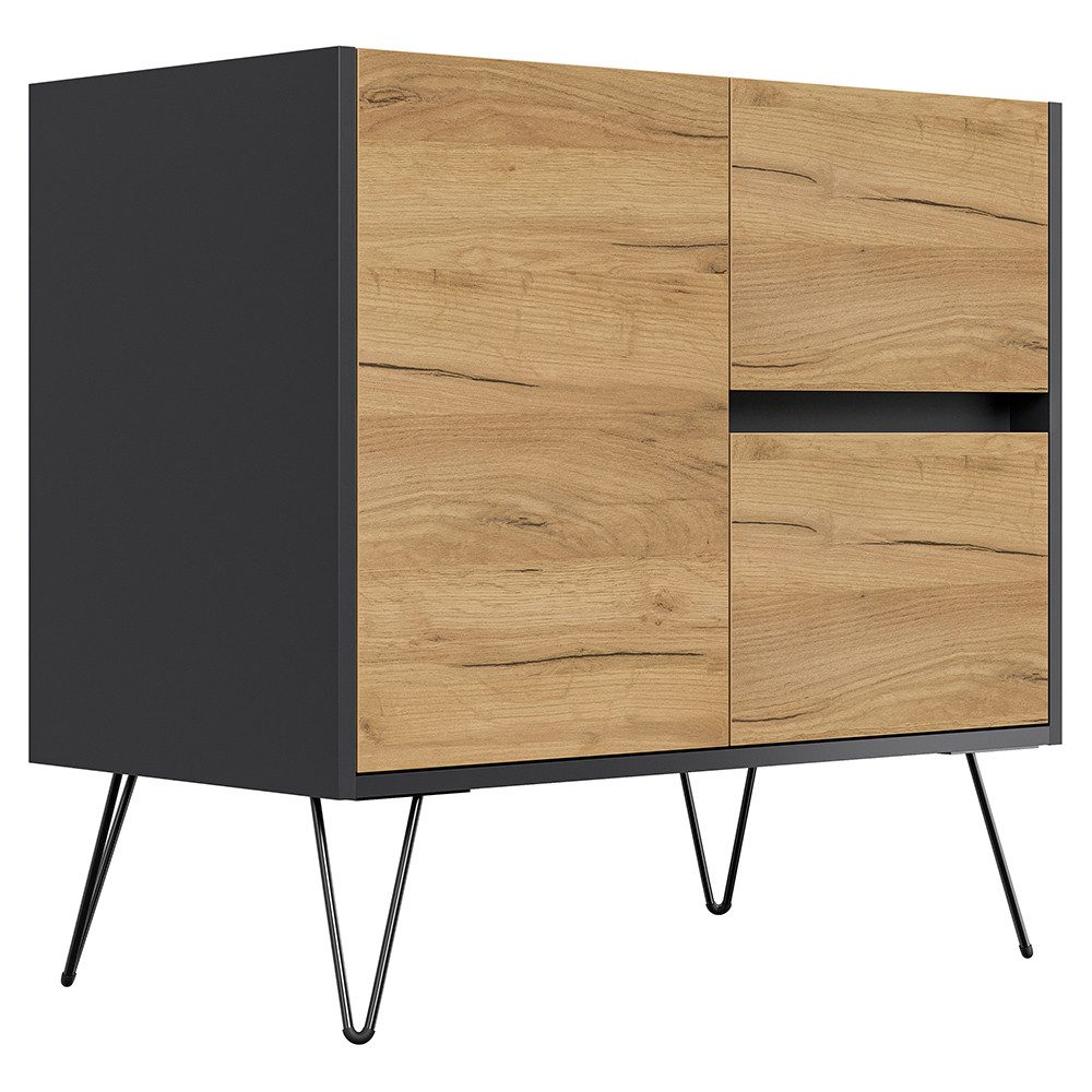 Modern und wohnlich zugleich: Diese Kommode kombiniert den dunklen Korpus in graphit mit warmen Fronten in Eiche-Nachbildung – ein stilvolles Zusammenspiel aus Kontrast und Natürlichkeit.