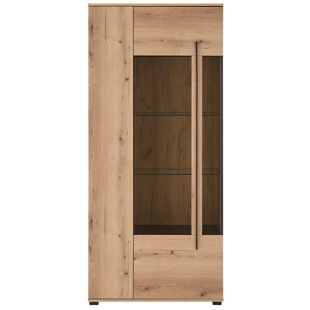 Diese Vitrine sieht nicht nur gut aus, sie bringt auch Ordnung in dein Zuhause. Die Kombination aus warmem Eiche-Dekor und der großen Glastür wirkt modern, aber nicht kühl. Hinter zwei Türen – links geschlossen, rechts mit Glaseinsatz – findest du viel Platz für Gläser, Geschirr oder Lieblingsstücke. Alles ist ordentlich verstaut und zugleich schön präsentiert. Ob im Wohn- oder Essbereich: Dieses Möbelstück schafft Struktur und macht deinen Raum sofort einladender und stilvoller.