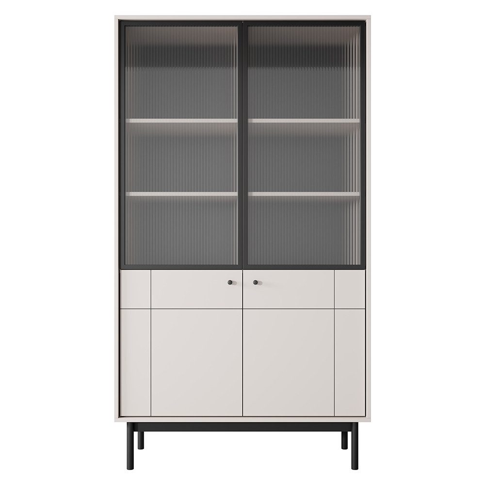 Die gefrästen Fronten verleihen den Möbelstücken einen einzigartigen Charakter und setzen ein stilvolles Statement in deinem Zuhause. Schwarze Metallknäufe und schwarz lackierte Holzfüße unterstreichen das minimalistische Design und sorgen für einen harmonischen Kontrast. Dank der Softclose-Funktion schließen die Türen und Schubladen besonders leise und sanft – für mehr Komfort im Alltag.