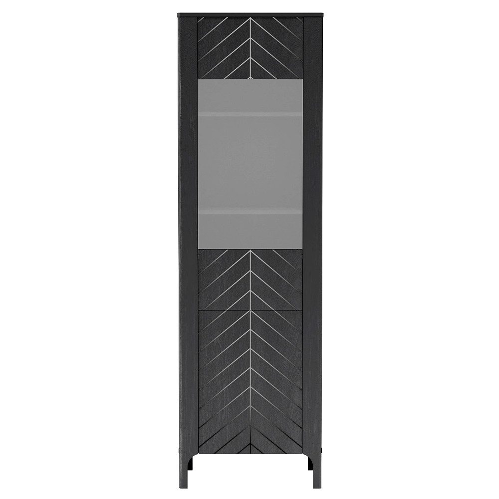 Elegant, schlank und absolut stilvoll: Diese schmale Vitrine bringt moderne Wohnkultur auf den Punkt. Die grifflosen Türen öffnen sich per leichtem Druck und schließen leise durch Softclose – ganz ohne Hektik. Hinter Glas und Fischgrätdekor warten fünf feste Fächer auf Lieblingsstücke, Bücher oder Deko. Perfekt für kleine Räume mit großem Anspruch an Design.
