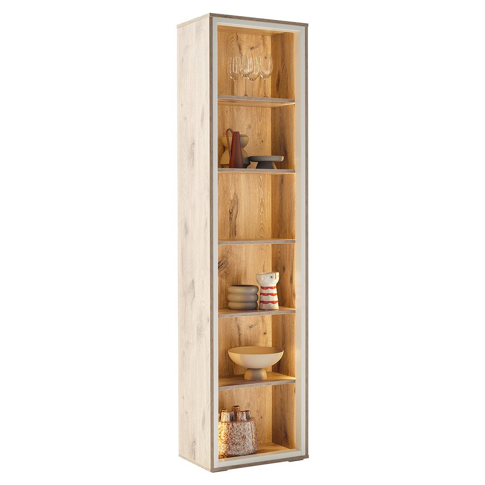 Sechs offene Fächer bieten großzügigen Platz für Dekoration, Bücher oder edles Geschirr, während die integrierte LED-Beleuchtung deine Lieblingsstücke elegant in Szene setzt. Der warme Korpus in Eiche Nachbildung harmoniert perfekt mit den weißen Elementen und verleiht deinem Wohn- oder Esszimmer eine stilvolle Note.
