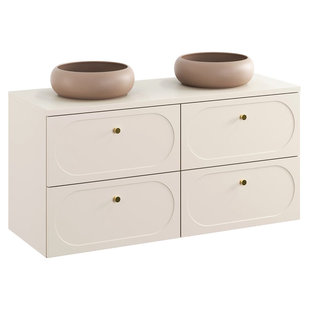 Vier großzügige Schubladen schaffen Ordnung, während zwei matte Aufsatzwaschbecken in Cappuccino den warmen Look vollenden. Sanft gerundete Fronten und goldene Knopfgriffe runden das elegante Design ab. Der sandfarbene Korpus sorgt für Ruhe und Balance – perfekt für alle, die morgens gemeinsam starten und dabei auf kein Detail verzichten wollen.