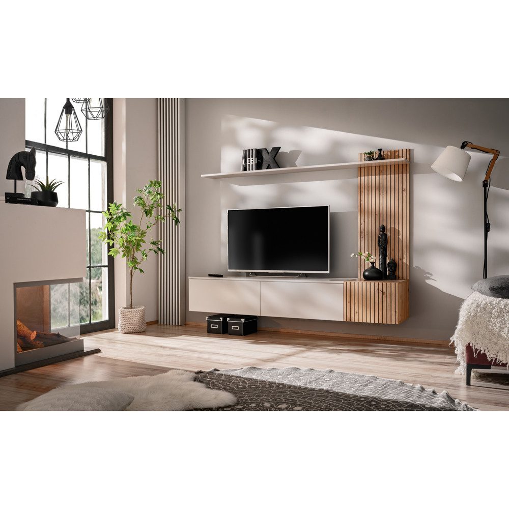 Das sanfte Kaschmir bringt ruhige Eleganz, während die Artisan-Holzoptik mit ihren feinen Paneellinien den Look moderner Design-Studios aufgreift. Das schwebende Lowboard öffnet den Raum, das Paneel zieht Blicke magisch an und die Ablage gibt deinen Lieblingsstücken einen stilvollen Platz.